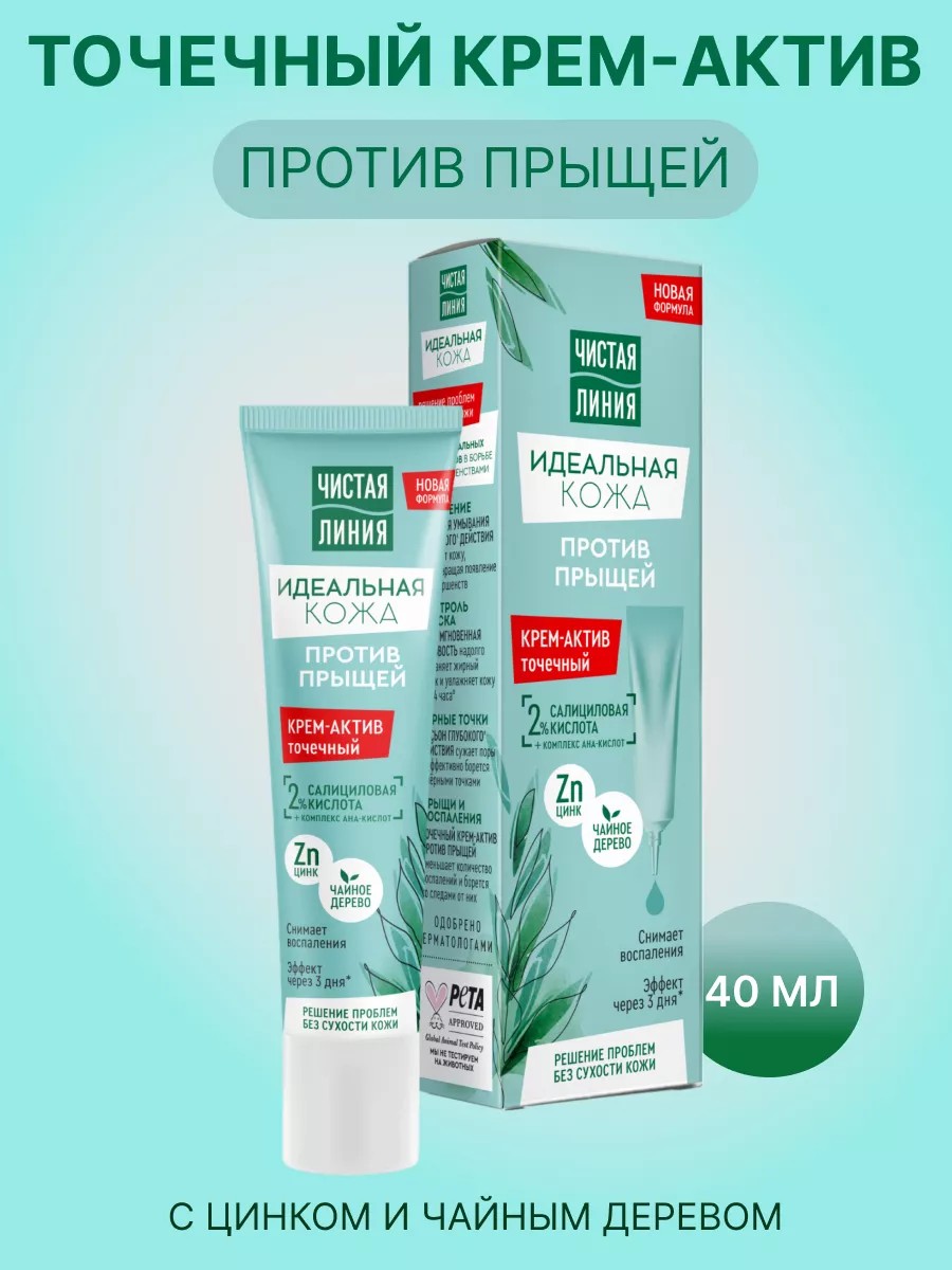 Если нужна срочная помощь против несовершенств кожи, попробуй крем-актив против прыщей с цинком и чайным деревом Идеальная кожа от Чистой Линии. Новая формула средства с высокоэффективными компонентами поможет тебе быстро справиться с несовершенствами, не пересушивая кожу. Результат будет заметен всего через три дня! Крем-актив Идеальная кожа эффективно борется с прыщами, нейтрализуя воспаления и следы от них.