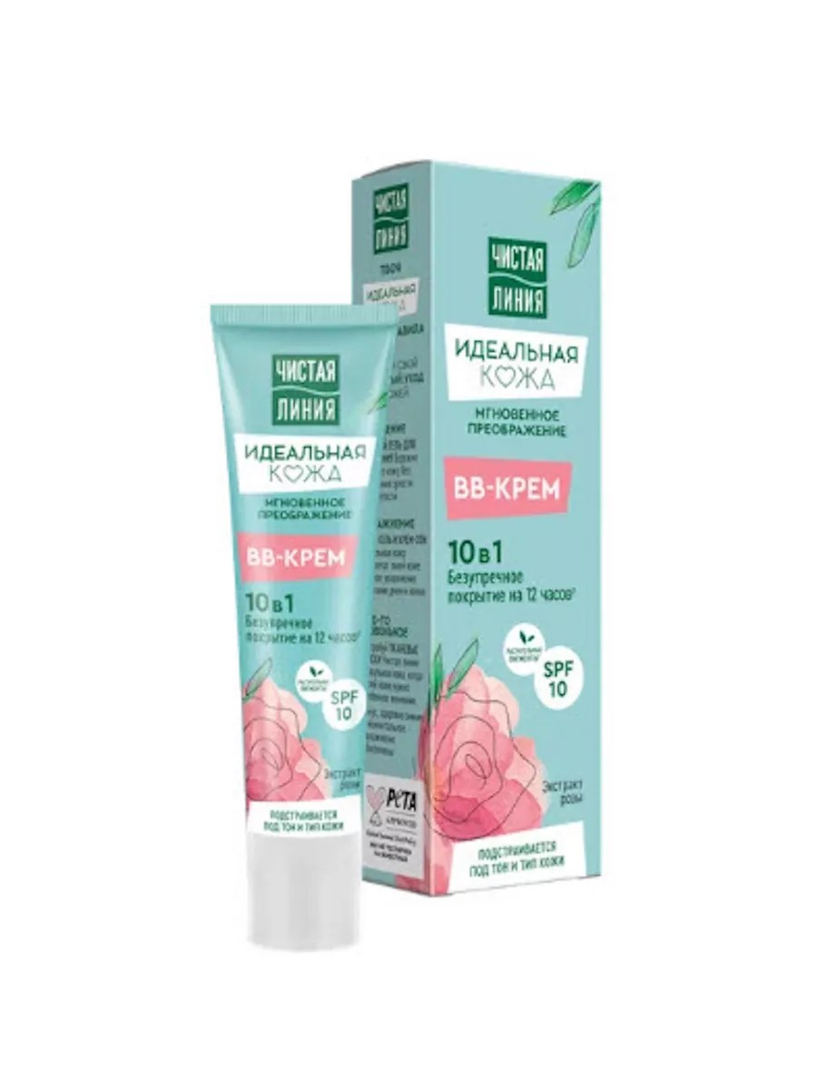 Чистая Линия BB-Крем для лица Идеальная кожа 10в1, 40 мл, 1 шт. Восхищайте ровным и сияющим тоном лица с кремом 10 в 1 Идеальная кожа Чистая Линия. Его невесомая текстура со светоотражающими частицами мгновенно преображает кожу. Средство ровно ложится, не создавая эффект маски. Экстракт розы увлажняет и улучшает цвет лица. Растительные1 и минеральные пигменты выравнивают тон и матируют. Увлажняет и питает на 24 часа. Скрывает несовершенства. Матирует кожу на весь день. Придает сияние и отдохнувший вид. Делает поры менее заметными. Создает безупречное покрытие на 12 часов. Защищает от UV-лучей благодаря SPF 10. Подстраивается под любой тип и тон кожи. Препятствует негативному влиянию окружающей среды.