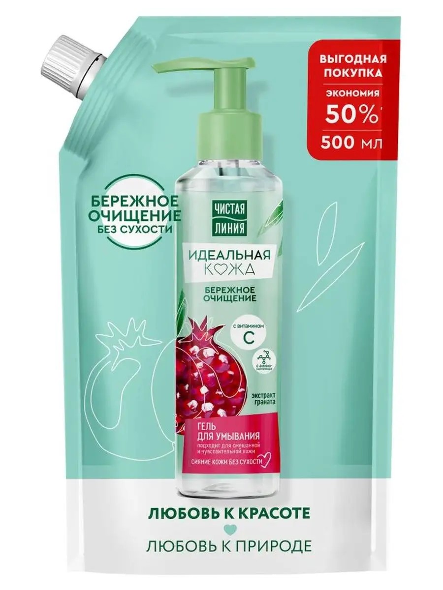 Чистая Линия, Гель для умывания Идеальная кожа с витамином с и экстрактом граната, 500 мл. Гель для умывания Идеальная кожа Чистая Линия теперь представлен в экономичном формате дой-пак. А это значит, что покупка стала выгоднее на 40%'. Гель имеет родственный коже рН, бережно и качественно очищает, не оставляя ощущения сухости и стянутости. Сбалансированный состав и нежная легкая текстура идеально подходят для очищения и ухода за молодой кожей: Витамин С делает цвет лица здоровым и сияющим, обеспечивает антиоксидантную защиту кожи и препятствует ее преждевременному старению. Аминокислоты укрепляют естественный защитный барьер кожи, восстанавливают водный баланс, участвуют в синтезе коллагена и эластина. Экстракт граната заряжает энергией антиоксидантов, контролирует неблагоприятное воздействие окружающей среды. Гель для умывания отлично подходит для смешанной и чувствительной кожи. Сразу после умывания ты почувствуешь, что кожа чистая, сияющая и мягкая. Подходит для ежедневного применения утром и вечером. Для наилучшего эффекта воспользуйся также другими продуктами серии Идеальная кожа. Сразу после умывания нанеси тоник Идеальная кожа для всех типов кожи, далее – крем-гель Идеальная кожа для всех типов кожи. Благодаря ежедневному уходу с продуктами серии Идеальная кожа ты получишь свежий и отдохнувший цвет лица, увлажненную и гладкую кожу. Ухаживай за своей кожей и сияй естественной красотой! Эксперты бренда Чистая Линия используют передовые технологии, накопленный опыт и тщательно отбирают ингредиенты, чтобы предложить действительно качественный продукт по доступной цене. Одобрено дерматологами. Не тестируется на животных.