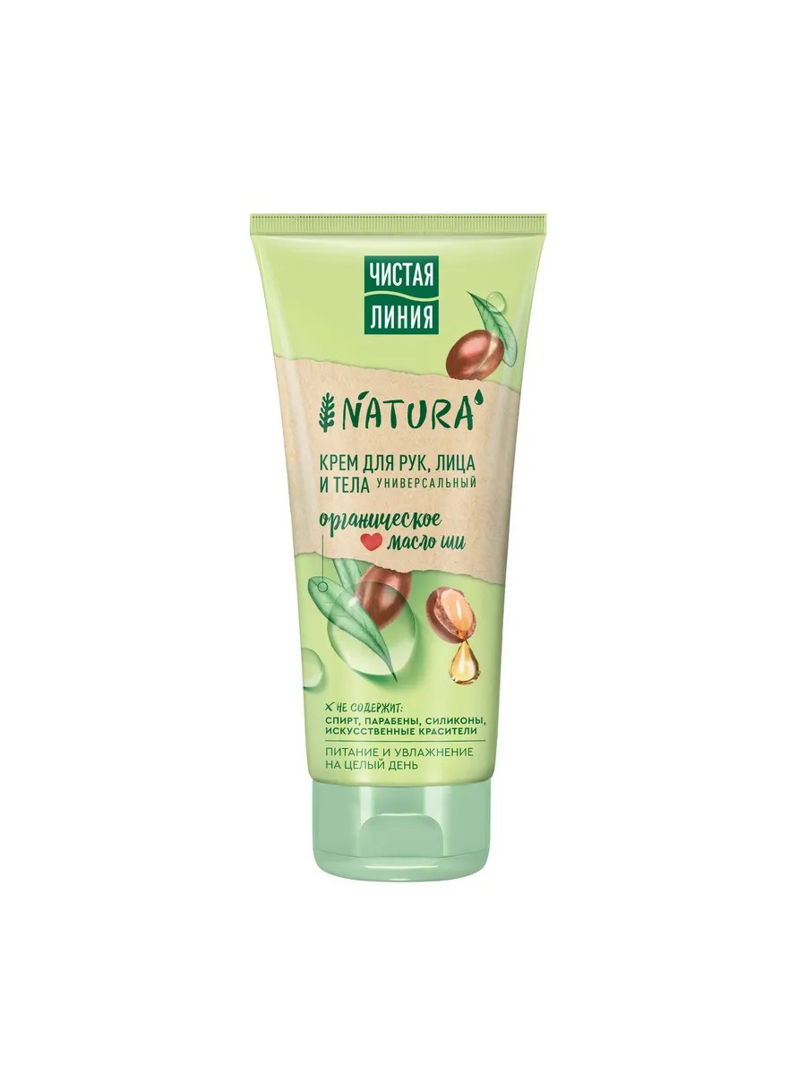 Крем для рук лица и тела ЧИСТАЯ ЛИНИЯ "Масло ши" увлажняет и смягчает кожу, успокаивает, защищает ее от воздействия солнечных лучей и способствует ее восстановлению, обладает противовоспалительной активностью и регенерирующими свойствами. Легкая текстура крема быстро впитывается и распределяется по коже, не оставляет ощущения липкости и жирности. Не содержит парабенов и спирта. Главный действующий ингредиент – organic масло ши – глубоко питает кожу, препятствуя испарению влаги, восстанавливает и возвращает коже упругость. Масло ши замедляет старение кожи.Крем подходит для всех типов кожи (в том числе для чувствительной). Клинически протестировано.Способ применения: ежедневно наносите на сухую чистую кожу лица, рук и тела.Состав: Aqua, Isopropyl Myristate, Glyceryl Stearate, Glycerin, Cetearyl Alcohol, Butyrospermum Parkii (Shea) Butter (в том числе органическое масло ши), Cocos Nucifera (Coconut) Oil, Rosa Canina Fruit Extract, Caramel, Glycine, Hydroxyacetophenone, Maltodextrin, Parfum, Phenoxyethanol, Polysorbate 20, Potassium Cetyl Phosphate, Sodium Polyacrylate.