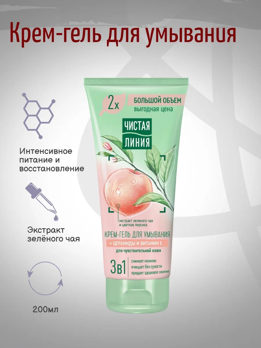 Добавьте в ежедневный уход новую усиленную формулу для комфорта вашей кожи°! Крем-гель для умывания Чистая Линия 3 в 1 с церамидами и витамином Е разработан с учетом потребностей чувствительной кожи.