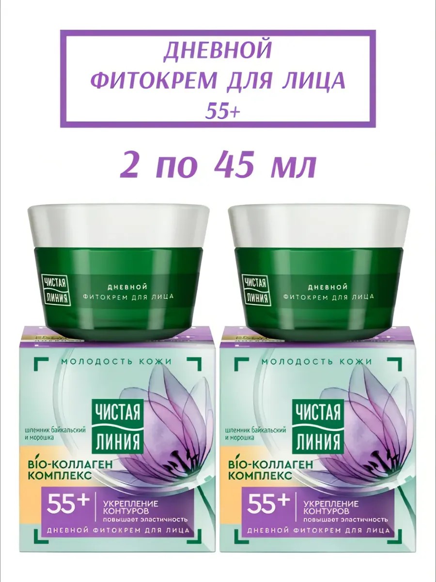 Дневной фитокрем 45мл "Чистая линия" с шлемником байкальским и морошкой для женщин старше 55 лет представляет собой уникальное средство для укрепления контуров кожи лица и шеи.
