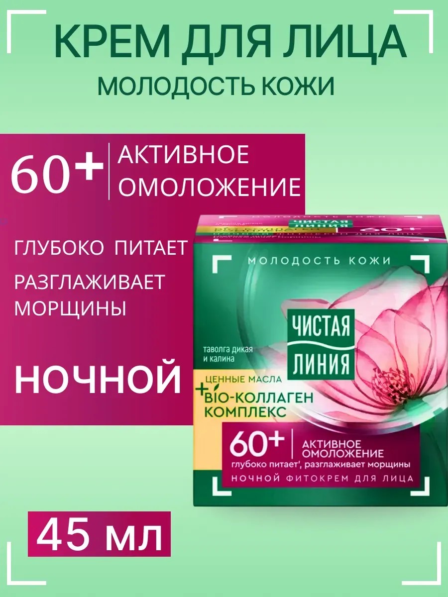 Чистая линия Крем для лица ночной Таволга и калина 60+, 45 мл