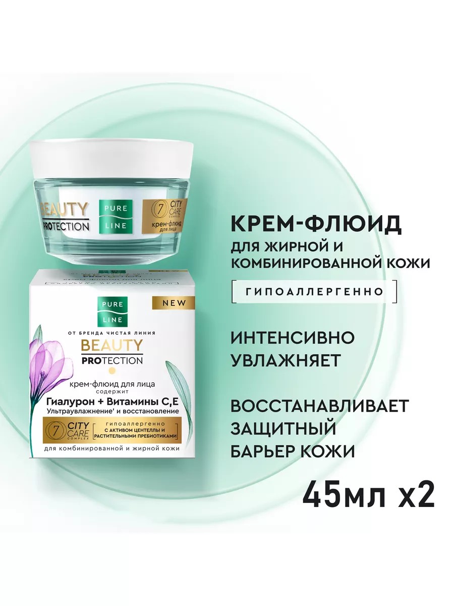 Крем-флюид для лица Чистая линия Pure Line. Разработан с учетом всех потребностей жирной и комбинированной кожи. Невесомая текстура легко впитывается и не оставляет пленки. В составе продукта ухаживающие ингредиенты. Гиалуроновая кислота интенсивно увлажняет, сокращает потерю влаги. Витамины С и Е оказывают антиоксидантное действие, помогают устранить раздражение и шелушение. Комплекс 7 CITY CARE 100% натурального происхождения с активом центеллы азиатской и растительными пребиотиками защищает от воздействия загрязнений окружающей среды. Уже после первого применения крема вы заметите результат: ощущение комфорта без раздражения, кожа более упругая и увлажненная, она выглядит отдохнувшей и свежей, меньше жирного блеска. Комплектация: 2 штуки в наборе.
