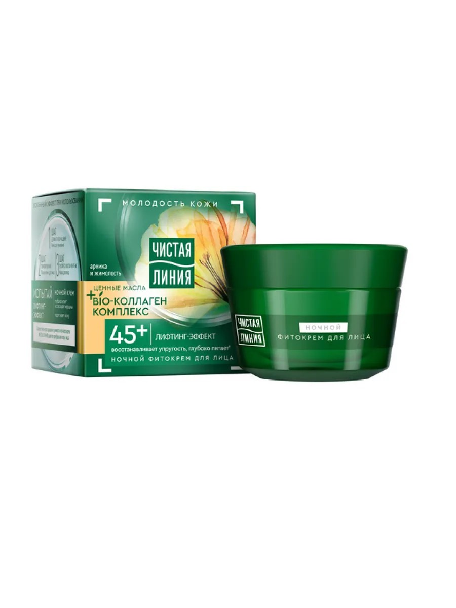Чистая Линия, Фито-крем ночной для лица 45+ Арника и жимолость 45 мл, 1 штука. Ночной крем с Фитоколлаген-комплексом, арникой и жимолостью Фито-линия от 45 лет эффективно насыщает влагой и питает кожу в ночное время. Активные компоненты Фитоколлаген-комплекса способствуют омоложению кожи: кожа разглаживается и наполняется энергией, цвет лица выглядит свежим, контуры шеи и лица становятся более четкими. Результат: мгновенно разглаживает мелкие морщины и подтягивает кожу за 16 дней выраженный лифтинг-эффект ,заметно меньше морщин, кожа интенсивно увлажнена, утром следы усталости исчезают