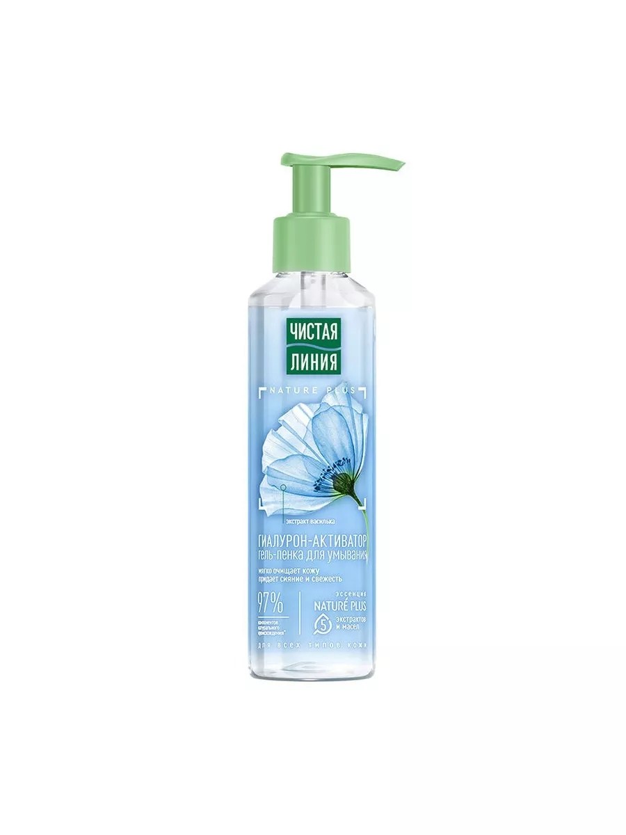 Чистая линия Гель-пенка Гиалурон-активатор для умывания для всех типов кожи, 160 млМягкая пенка Чистая линия с экстрактом василька и эссенцией Nature Plus очищает кожу от ежедневных загрязнений, придает ей сияние и свежесть. Одобрено дерматологами. Подходит для всех типов кожи. Эссенция из пяти экстрактов и масел Nature Plus (экстракт вербены, экстракт пиона, масла миндаля, льна, оливы) восстанавливает и тонизирует кожу. 97% компонентов натурального происхождения в составе.Способ применения: Вспеньте небольшое количество геля в ладонях, нанесите на влажное лицо, помассируйте и смойте водой.Состав:Aqua, Sodium Laureth Sulfate, Cocamidopropyl Betaine*, Sodium Cocoamphoacetate*, PEG-7 Glyceryl Cocoate*, PEG-6 Caprylic/Capric Glyceride*, Centaurea Cyanus Flower Extract (экстракт василька)*,;Hydrolyzed Hyaluronic Acid (гидролизованная гиалуроновая кислота)*, Olea Europaea (Olive) Fruit Oil (масло оливы ферментированное)*, Linum Usitatissimum (Linseed) Seed Oil (льняное масло)*,;Paeonia Officinalis Flower Extrac* (экстракт пиона), Prunus Amygdalus Dulcis (Sweet Almond) Oil* (масло миндальное), Sodium Carrageenan (растительный гиалурон-активатор)*, Sodium Hyaluronate (натрия гиалуронат)*,;Verbena Officinalis Leaf Extract (экстракт вербены)*, Benzoic Acid, Benzophenone-4, Benzyl Alcohol, Candida Bombicola/Glucose/Methyl Rapeseedate Ferment*, Citric Acid*;Dehydroacetic Acid, Evernia Prunastri (Oakmoss) Extract*, Evernia Furfuracea (Treemoss) Extract*, Glycerin*, Sodium Chloride, Glycine*,;Parfum, PEG-55 Propylene Glycol Oleate, Phenoxyethanol, Propylene Glycol, Potassium Sorbate, Sea Salt*, Sodium Benzoate.*в составе отмечены компоненты натурального происхождения