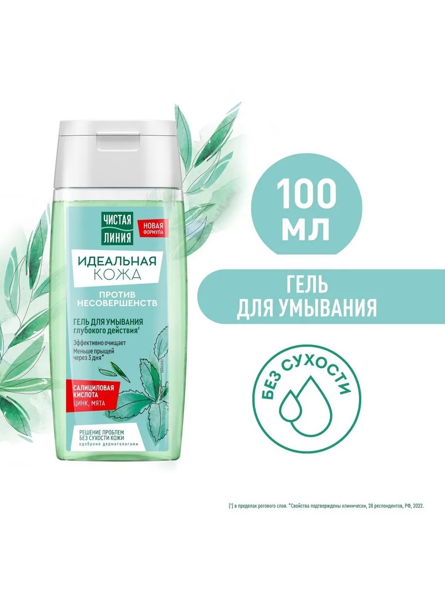 Гель для умывания Чистая Линия глубокого действия, "Идеальная кожа", 100 мл. Гель для умывания глубокого действия. Идеальная кожа эффективно очищает и действует целенаправленно против несовершенств кожи. Прыщей становится меньше уже через 3 дня. Состав продукта идеально подходит для решения проблем твоей кожи. Так, цинк замедляет воспалительные процессы, нормализует выработку себума. Салициловая кислота регулирует отшелушивание и обновление поверхностного слоя кожи. Экстракт перечной мяты тонизирует и освежает кожу. Сразу после умывания ты почувствуешь, что кожа прекрасно очищена без сухости и стянутости, готова к тонизированию и увлажнению. В пределах рогового слоя. *Свойства подтверждены клинически, 28 респондентов, РФ, 2022. Состав: Вода,лауретсульфат натрия,ПЭГ - 7 глицерилкокоат,кокамидопропилбетаин,глицерин, пропиленгликоль,кокоамфоацетат натрия,хлорид натрия,глицин соевое масло, экстракт мяты перечной,бензойная кислота,лимонная кислота,дегидроуксусная кислота, лауретсульфосукцинат динатрия,глицин,гликолевая кислота,молочная кислота,яблочная кислота, отдушка,олеат пропиленгликоля ПЭГ - 55,салициловая кислота,салицилат натрия, цитрат натрия,гликолат натрия,лактат натрия,малат натрия, натрия PCA,сульфат цинка,бензиловый спирт,CI 19140,CI 42090; Объем: 100; Область использования: Лицо; Тип кожи: Для проблемной кожи; Вид средства для ухода за кожей: гель; Срок годности: 730; Целевая аудитория: Взрослая;