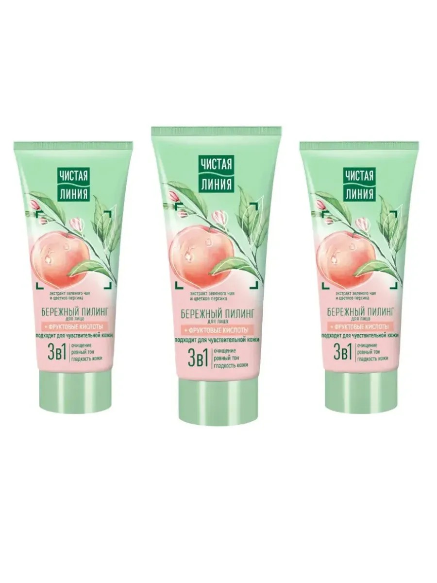 Попробуйте новинку Чистая Линия — бережный пилинг для домашнего ухода с фруктовыми кислотами 50 мл, 3 шт. Он действует сразу в 3-х направлениях: очищает, выравнивает тон кожи и придает гладкость.