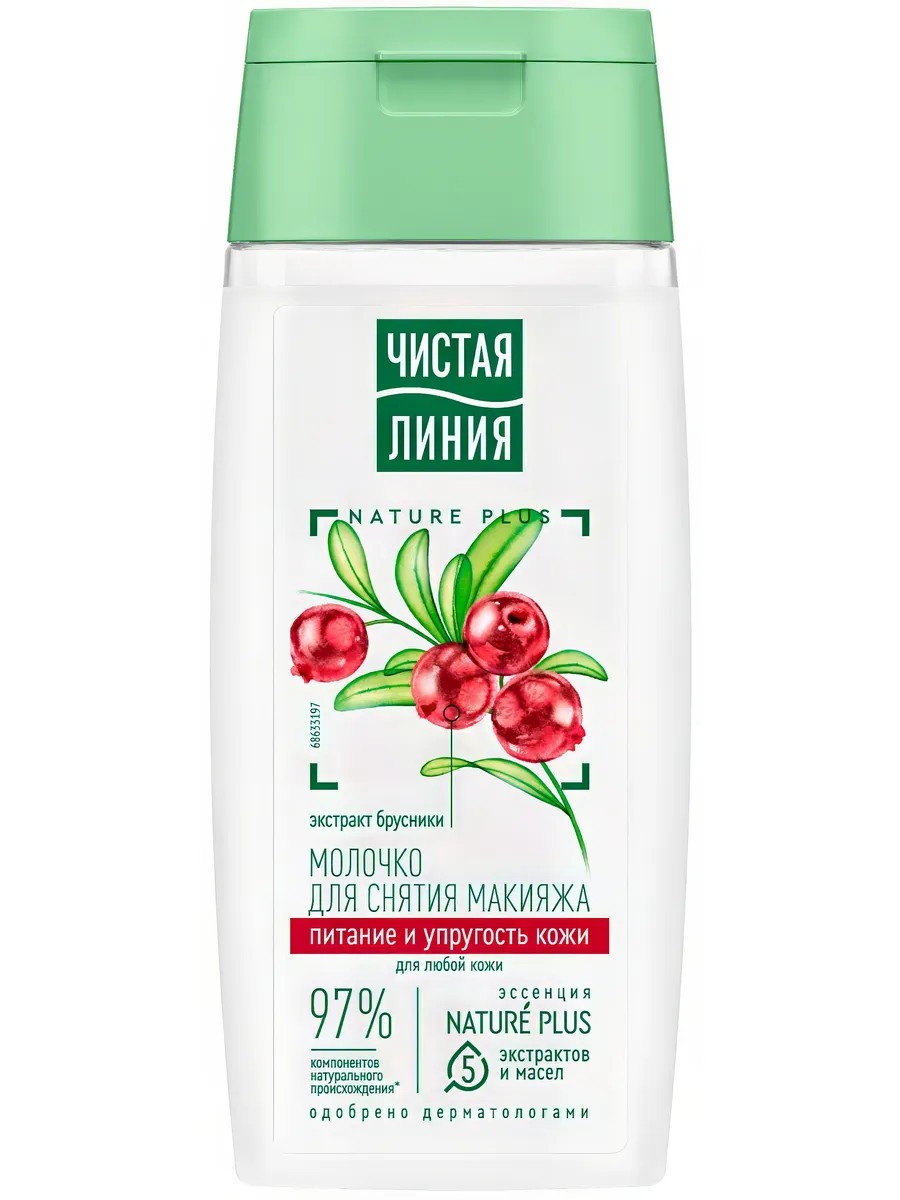 Молочко Чистая Линия Питание и упругость для снятия макияжа, для любой кожи, с экстрактом брусники, 100 мл Встречайте обновленное молочко для снятия макияжа от Чистой Линии с усиленной формулой и новым дизайном! Эксперты бренда Чистая Линия разработали молочко для снятия макияжа, которое подходит для всех типов кожи, и действует сразу в нескольких направлениях: деликатно снимает макияж, препятствует потере упругости, увлажняет и питает кожу. В составе продукта 97% компонентов натурального происхождения*! Эссенция NATURE PLUS НЕЙЧЕ ПЛЮС это пять экстрактов и масел для ухода за кожей. Экстракт вербены восстанавливает баланс увлажненности и тонизирует. Экстракт пиона и льняное масло успокаивают и смягчают. Масло миндаля содержит жирные кислоты, витамины Е и F, питает и выравнивает поверхность кожи. Ферментированное оливковое масло питает и защищает от преждевременного старения. Экстракт брусники препятствует потере упругости кожи. Свойства подтверждены потребительским тестированием: 86% респондентов отметили, что молочко деликатно удаляет загрязнения и макияж; 84% кожа стала более мягкой и бархатистой; 74% молочко не только очищает кожу, но и активно ухаживает за ней. После снятия макияжа воспользуйтесь кремом для лица, подходящего вашему типу кожи, а также кремом вокруг глаз Чистая Линия. 100% переработанный пластик флакона. Продукт не тестируется на животных. Мы берем лучшее от природы, чтобы позаботиться о вашей красоте, и верим, что о природе нужно заботиться так же, как о себе.