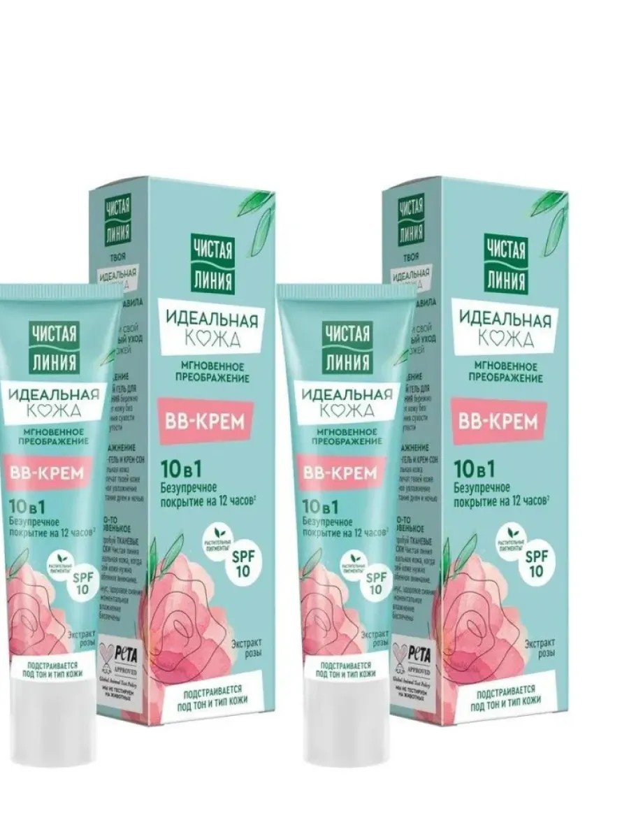 ВВ-Крем для лица Чистая Линия Идеальная кожа 10в1 Мгновенное преображение с экстрактом розы 40мл – многофункциональное средство, которое легко подстраивается под любой тип и тон кожи. Его невесомая текстура со светоотражающими частицами скрывает несовершенства кожи, придает ей сияние и отдохнувший вид; растительные и минеральные пигменты выравнивают ее тон и матируют; экстракт розы интенсивно увлажняет и улучшает цвет лица. Крем не скатывается при нанесении, ровно ложится, не забивает поры, не создает эффект маски. А благодаря SPF 10 он защищает кожу лица от негативного влияния UV-лучей. Продукт одобрен дерматологами.