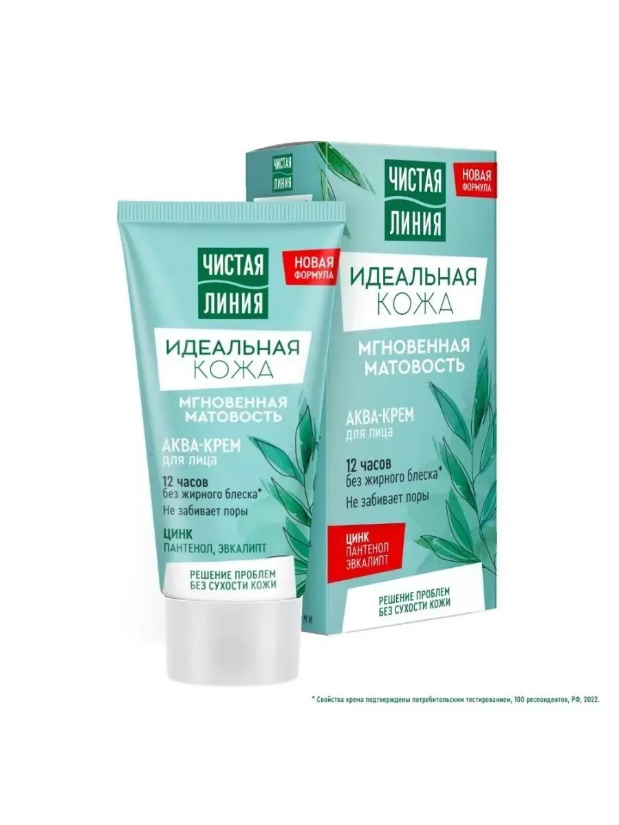 ЧИСТАЯ ЛИНИЯ ИДЕАЛЬНАЯ КОЖА АКВА-КРЕМ МГНОВЕННАЯ МАТОВОСТЬ 50МЛ«Чистая линия» - российский косметический бренд, который сформирован на принципах фитотерапии.Чистая Линия ИДЕАЛЬНАЯ КОЖА Аква-крем для лица Мгновенная матовостьВнешний вид: Кремово-гелевая текстура белого цвета со свежим ароматом.Наша кожа нуждается в тщательном уходе в любом возрасте. Молодая кожа часто требует эффективного, но бережного очищения от черных точек и прыщей, увлажнения без эффекта пленки и избавления от жирного блеска.Идеальная кожа - мечта каждой девушки! Поэтому специалисты бренда Чистая Линия создали серию средств Идеальная кожа для разных типов кожи, чтобы помочь девушкам достичь совершенства.Активные компонеты: Цинк, экстракт эвкалипта.Преимущества:Увлажняет 24 часа.12 часов без жирного блеска.Не закупоривает поры.Кожа матовая и бархатистая.Решение проблем без сухости кожи.Результат: Очищение кожи; устранение жирного блеска. Идеальная кожа.Наносите крем утром и вечером на очищенную кожу. Является прекрасной основой для макияжа.