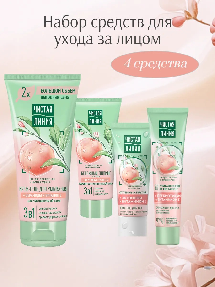 Крем-гель для век Чистая Линия с эктоином и витамином Е — это эффективное средство, которое обеспечивает оптимальный уход для кожи вокруг глаз. Крем обеспечивает мгновенное увлажнение кожи, повышает ее эластичность и упругость, поддерживает водный баланс кожи, оказывает мощное антиоксидантное действие. Крем-комфорт для лица Чистая Линия — это эффективное уходовое средство для всех типов кожи, в том числе для чувствительной. Крем с витамином Е и пребиотиками обеспечивает коже интенсивное увлажнение и питание в течение 24 часов. Крем для лица гипоаллергенный с экстрактами персика и зеленого чая питает, смягчает и увлажняет кожу. Успокаивающий крем для лица улучшает способность кожи удерживать влагу, сохраняя ее более мягкой и гладкой. Гель для умывания 3 в 1 с церамидами и витамином E для чувствительной кожи бережно снимает макияж, но и очищает без сухости, придает здоровое сияние благодаря активным ингредиентам в его составе. Церамиды уменьшают излишнюю чувствительность и восстанавливают эластичность. Витамин Е, известный своим антиоксидантным действием, успокаивает кожу, снижает покраснения. Экстракт зеленого чая, благодаря содержанию полифенолов, нейтрализует свободные радикалы, которые ускоряют процесс старения, а также увлажняет и смягчает кожу. Экстракт персика увлажняет и тонизирует кожу, возвращает ей упругость и тонус. Раскрывает сияние и разглаживает морщины, питает и смягчает кожу, делает ее бархатистой, эластичной и упругой. Успокаивает и предотвращает шелушение. Пилинг для лица бережный с фруктовыми кислотами действует сразу в 3-х направлениях: очищает, выравнивает тон кожи и придает гладкость. Фруктовые кислоты оказывают на кожу отшелушивающее, увлажняющее, обновляющее действие, а также стимулируют синтез коллагена. Зеленый чай тонизирует и увлажняет, защищает от преждевременного старения, улучшает цвет лица и состояние кожи любого типа и возраста.