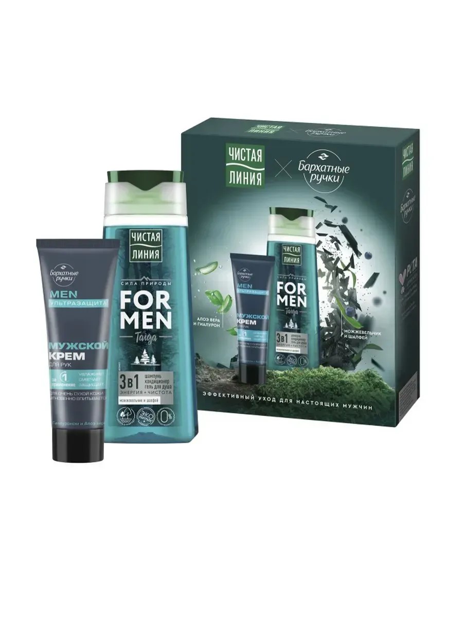 Оптимальный выбор для заботы о коже рук и бережного очищения волос и кожи. В набор входит шампунь для волос 3в1 Чистая Линия Энергия+Чистота и мужской крем для рук Бархатные Ручки.