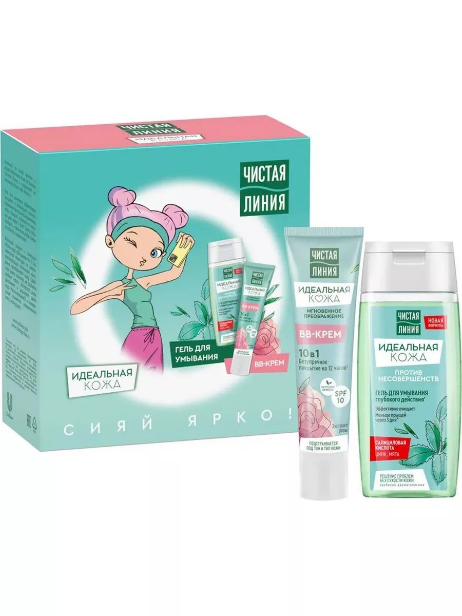 Набор уходовой косметики Чистая Линия "Идеальная кожа", ВВ - крем 10 в 1, Гель для умывания глубокого действия. Первый и один из самых важных шагов на пути к идеальной коже - качественное очищение, соответствующее типу кожи. Специально для молодой кожи эксперты бренда Чистая Линия разработали гель для умывания глубокого действия' Идеальная кожа. Он эффективно очищает и действует целенаправленно против несовершенств кожи. Прыщей становится меньше уже через 3 дня!* Всего один продукт - и твоя кожа вновь сияет чистотой и свежестью! Состав геля для умывания идеально подходит для решения проблем твоей кожи: цинк нормализует выработку себума; салициловая кислота регулирует отшелушивание и обновление поверхностного слоя кожи; экстракт перечной мяты тонизирует и освежает кожу. Сразу после умывания ты почувствуешь, что кожа очищена без сухости и стянутости, готова к тонизированию и увлажнению. Специально для ровного и сияющего тона лица эксперты бренда Чистая Линия разработали ВВ - крем 10 в 1 Идеальная кожа. Гарантированное безупречное покрытие на 12 часов2. Его невесомая текстура со светоотражающими частицами мгновенно преображает кожу. Экстракт розы увлажняет и улучшает цвет лица. Растительные1 и минеральные пигменты выравнивают тон и матируют. Защищает от UV - лучей благодаря SPF 10. Ровно наносится и подстраивается под любой тип и тон кожи без эффекта маски. Одобрено дерматологами. Не тестируется на животных