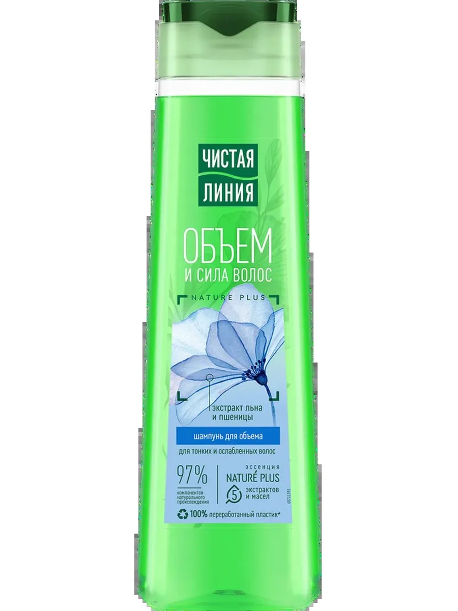 Шампунь для тонких и ослабленных волос ЧИСТАЯ ЛИНИЯ «Объем и сила/Отвар трав/Лен и пшеница» интенсивно увлажняет и питает кожу головы. Активные натуральные компоненты средства ухаживают и восстанавливают волосы, образуют невидимый каркас вокруг каждого волоса, поддерживающий объем от корней без утяжеления. Пшеница – природного концентрата витаминов. Помимо витаминов (A, E, F, B, D), в масле присутствуют микроэлементы цинк и селен, большое количество линолевой и других органических кислот. Потрясающий эффект лен оказывает на волосы, создает вокруг волоса невидимый каркас, поддерживает объем у корней без утяжеления. В состав льна входят белки, жиры, клетчатка, витамины групп А, В, Е, F, микроэлементы, фитоэстрогены, пектины, масла и незаменимые аминокислоты. Такое богатство биологически активных компонентов делает семена льна отличным средством для ухода. Доказано: при использовании шампуня совместно с бальзамом эффективность возрастает в 3 раза!