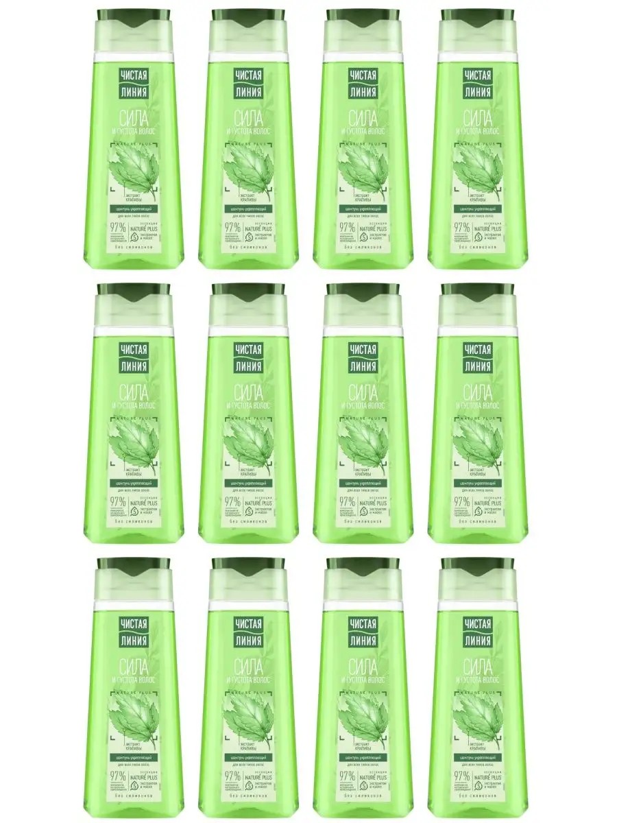 Chistaya Liniya, Strength and Thickness Shampoo. 12 250 ml bottles. Chistaya Liniya experts developed a strengthening shampoo with a decoction of the medicinal herb Nettle, which is 97% naturally derived and suitable for all hair types. The 5 Nature Plus essence, made from 5 carefully selected extracts and oils, prevents hair loss, nourishes, and protects hair from damage.