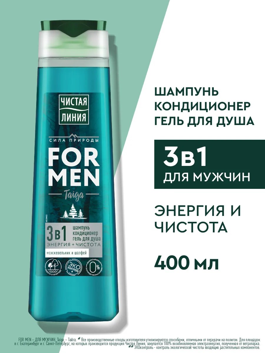Шампунь и кондиционер для волос мужской 3в1 с лупулином’ оказывает успокаивающее действие. Мужской гель для душа и шампунь TAIGA с маслом можжевельника укрепляет волосы, ухаживает за кожей головы. Очищающий шампунь Чистая Линия 400 мл с флавоноидами* и витаминами оказывает капилляроукрепляющий эффект.