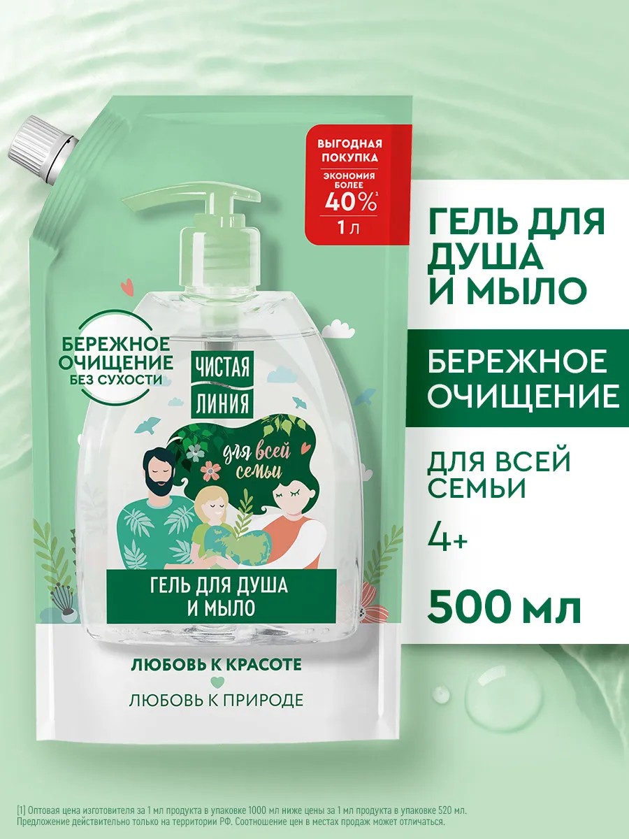 Гель для душа и жидкое мыло Чистая Линия для всей семьи – идеальное экономичное решение с заботой о вашей коже. Можно использовать как жидкое мыло и как гель. Мыло бережно очищает кожу рук и тела. Гель для душа увлажняет и заботится о вашей коже.