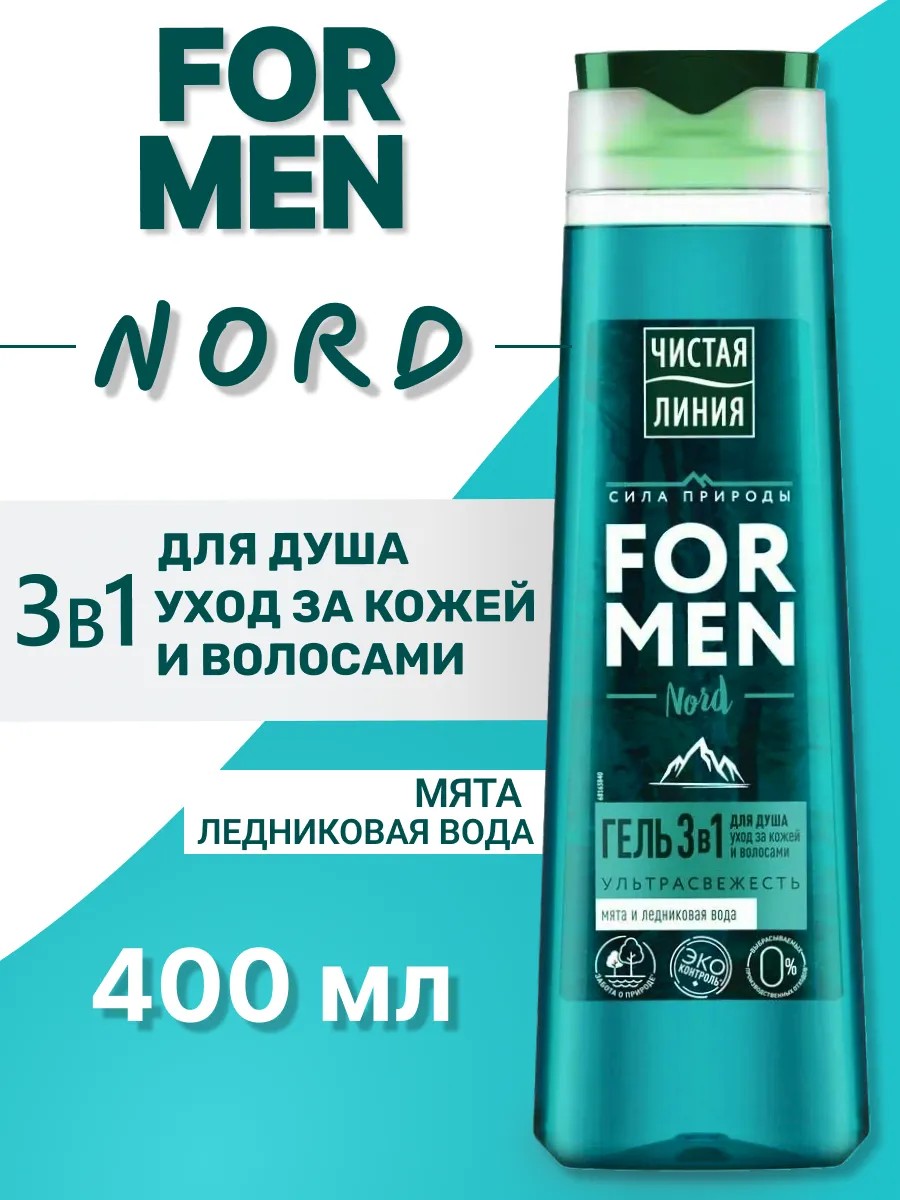Шампунь и гель для душа 3 в 1 Ультрасвежесть For Men Nord российской компании Чистая линия входит в состав фирменной коллекции косметических средств по уходу за кожей для мужчин «Сила природы».