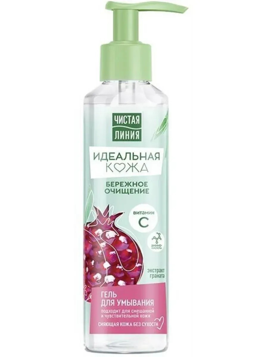 Чистая Линия Гель для умывания Идеальная кожа, 160 мл, 1 штука. В юности особенно важно деликатное очищение лица. Для решения этой задачи и специалистами бренда Чистая Линия была создана особенная косметика – Чистая Линия Идеальная кожа гель для умывания нежное очищение, 160 мл. Средство разработано для девушек с нормальной и комбинированной кожей. Этот гель для умывания сделает твой утренний уход за кожей лица особенно нежным – продукт не содержит мыла и деликатно очищает, не вызывая неприятного ощущения сухости. Как и другие товары бренда Чистая Линия, он изготовлен на основе натуральных природных компонентов. Гель для лица с экстрактом граната дарит клеткам эпидермиса антиоксиданты и витамины для тонуса и энергии, а входящая в состав эссенция ромашки активизирует восстановление кожи, питает ее и увлажняет на целых 24 часа! Гель для кожи будет работать еще эффективнее, если ты будешь пользоваться им вместе с другими товарами линейки Идеальная кожа – ведь они разработаны специально для молодых девушек. Вечером выполни снятие макияжа вулканической мицеллярной водой, нанеси крем-сон и утром получи наслаждение от чистой, гладкой и свежей, по-настоящему идеальной кожи!