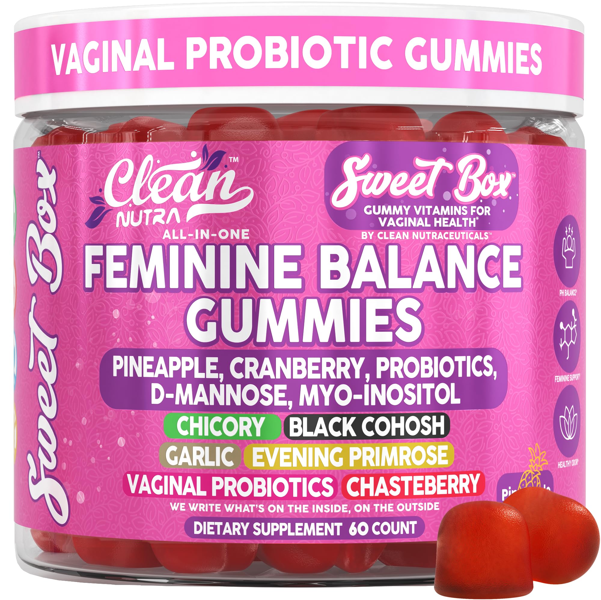 Meet Clean Nutraceuticals Sweet Box Feminine Balance Gummies, a mouth-watering 60-gummy vitamin that unites pineapple gummies for women ph with cranberry sweetness to champion ph balance for women and daily confidence. In every chew you receive a science-backed fusion of probiotics for women, prebiotics and probiotics for women, and a gentle hit of inulin fiber so your gut health flourishes from the inside out. Our Sweet Box women's blend layers myo inositol, vitex, evening primrose and black cohosh with naturally sourced GLA to encourage hormonal balance for women, smooth cycle transitions and added menopause comfort— all without pills or chalky powders. A smart 50 mg shot of d mannose teams with a premium cranberry supplement and vaginal probiotics to bathe the urinary tract in plant-based purity, while garlic, folate, zinc and iron round out broad-spectrum nourishment found in very few supplements for women. Unlike ordinary probiotic gummies, each Clean Nutraceuticals gummy also carries ten diverse strains— the same cultures found in top womens probiotic capsules— to reinforce vaginal harmony and digestive comfort. The result? ph gummies that double as tasty, vegan treats yet deliver serious feminine care from urinary freshness to nutrient support. We craft every batch with responsibly sourced pineapple extract, chicory root, chasteberry, botanically rich night-bloom primrose, and black garlic-free purity, then test for potency, heavy metals and microbes. No artificial colors, gluten, soy or dairy— just non-GMO feminine goodness you can feel. Produced in a certified facility in the USA, these premium feminine balance gummies arrive in recyclable bottles and are backed by our 100 satisfaction promise. Choose Clean Nutraceuticals when hormone balance, vaginal comfort and overall wellness matter. One flavorful serving provides women vitamins for active days, gentle support during perimenopause, and feel-good harmony that lets you live boldly every day.Vetted and trusted ingredients—garlic supplements standardized for allicin, premium cranberries, probiotics for digestive health, zinc, and vitamin C—are crafted in a lab tested USA facility. Non-GMO, gluten-free, and free of artificiasl dyes, these supplements for women champion feminine care while supporting gut health for women, probiotic for women, and overall wellness, empowering you to feel vibrant, balanced, and unstoppable every single day. A powerful all-in-one cranberry supplement combines womens probiotic strains, vitex chasteberry supplement for women, zinc supplements for women, and black cohosh for menopause hot flashes to promote menopause relief, hot flash relief for women, and comprehensive hormone balance for resilient wellness. This easy 60-gummy supply doubles as a women's multivitamin by delivering folic acid supplements for women, iron, and vitamin C, replacing multiple bottles with one crave-worthy ritual. Introducing the Proprietary SweetBox Blend—an expert fusion of d mannose, myo inositol, black cohosh, chasteberry, evening primrose, chicory inulin, and antioxidant vitamin C that partners with a precise d-mannose probiotic complex to nurture vaginal probiotic diversity, hormone support for women, and healthy flow blood support. Unlike gritty dmannose pills or heavy primrose oil liquids, our gummies maximize absorption while tasting like fresh pineapple cranberry paradise. The all-in-one ph gummies you've been looking for pack prebiotics probiotics into mouth-watering pineapple gummies for women ph that outperform messy cranberry juice 100 percent, bulky cranberry pills for women, earthy chlorophyll gummies, or oily evening primrose oil. Ditch chalky capsules or bland inositol powder—just two low-sugar chews supply pre and post probiotics, folate, and iron for total feminine care, urinary comfort, digestive harmony, enhanced energy, and daily vitality. Advanced feminine balance gummies for women combine probiotics for women, cranberry supplement, and ph balance for women support with a specialized vaginal probiotics matrix to promote hormonal balance for women, urinary tract comfort, and gut health. Each juicy pineapple flavored gummy delivers 60-billion CFU-equivalent cultures from 12 Lactobacillus and Bifidobacterium strains plus vitamin C, zinc, and iron, keeping you fresh, confident, and in perfect sync every single day.