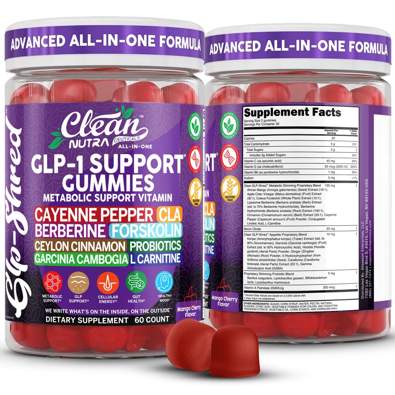 Convenient Gummies: Skip the hassle of multiple supplement bottles and enjoy an all-in-one gummy format with Berberine, Forskolin, and probiotics, created for those who value efficiency, taste, and simplicity. Trusted Quality: Clean Nutra focuses on delivering gummies with balanced blends such as Garcinia Cambogia fruit extract, L-Carnitine, and CLA to help customers simplify their wellness habits in a clean and reliable way. Innovative Formula: Crafted with carefully selected botanicals and functional ingredients including cayenne pepper extract, ceylon cinnamon bark, and probiotics to help provide variety and versatility in your daily supplement regimen. 60 Count Supply: Every bottle contains 60 gummies in a tasty mango cherry flavor, offering a simple way to enjoy a broad combination of ingredients in one chewable option without the need for capsules or powders. Premium Ingredient Blend: Each serving combines Cayenne Pepper, CLA, Berberine, Forskolin, Ceylon Cinnamon, Probiotics, Garcinia Cambogia, and L-Carnitine in a convenient gummy form designed for everyday routines.