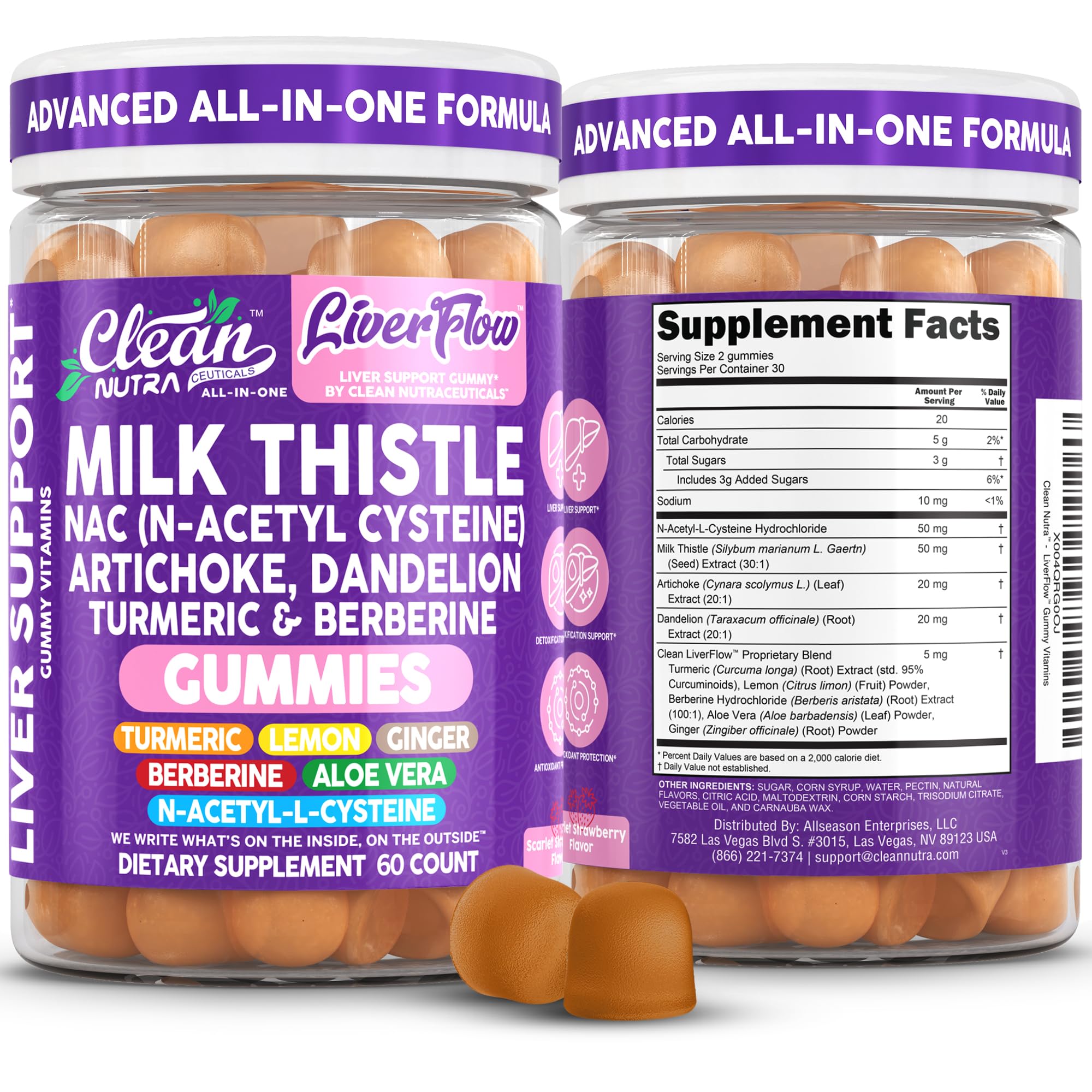 Vetted and trusted ingredients – Clean Nutraceuticals' unwavering commitment to plant-based vitality delivers consistent potency confirming you receive the best liver cleanse detox repair benefits. These vegan gummies are crafted in a U.S. cGMP facility, non-GMO, gluten-free and low sugar, giving you confidence to choose an ultraliversupport product, helping you maintain balanced energy, smooth digestion and uncomplicated routine efficiency. A powerful all-in-one supplement in a delicious chew: our formula pairs clinically concentrated dandelion root extract with prebiotic inulin, alkalizing chlorophyll and quercetin-rich lemon peel to help detoxify pathways, encourage heavy metal detox, promote GI wellness and sustain smooth bile flow. Two gummies effortlessly replace separate dandelion root supplement capsules, gallbladder supplements and elaborate liver cleanse regimens, supporting balanced metabolism every day. Introducing the Clean LiverGlow blend: a precision fusion of standardized turmeric supplement delivering bioactive curcumin with black pepper, high-potency artichoke extract 20:1, soothing aloe, lemon bioflavonoids and ginger supplements to promote liver detox, gallbladder comfort and gut health vibrancy. This advanced matrix nourishes hepatocytes while supporting digestive health, helping you thrive without juggling greens powder jars, bulky capsule packs or complex routine resets every week. The all-in-one antioxidant blend you've been looking for: our convenient 60-count gummies wrap robust milk thistle extract, 600 mg equivalent milk thistle liver detox actives and dandelion root goodness into a tasty chew, saving you from messy milk thistle drops, bitter dandelion root tea, chalky turmeric powder or pricey detox tea kits. Each serving powers superliverhealth, full-body cleanse and gentle detox cleanse support without the hassle of multiple capsules or tablets. Advanced botanical Liver Support for adults: each delicious Clean Nutraceuticals gummy packs berberine plus a full 600 mg equivalent of premium nac supplement to deliver multi-pathway liver support. Combined with cleansing-focused citrus, aloe and ginger powders, this powerhouse duo helps maintain healthy liver enzyme function, encourages balanced metabolism, promotes smooth bile flow, kidney filtration, and the removal of waste, helping you feel energized and prepared to take on the day.