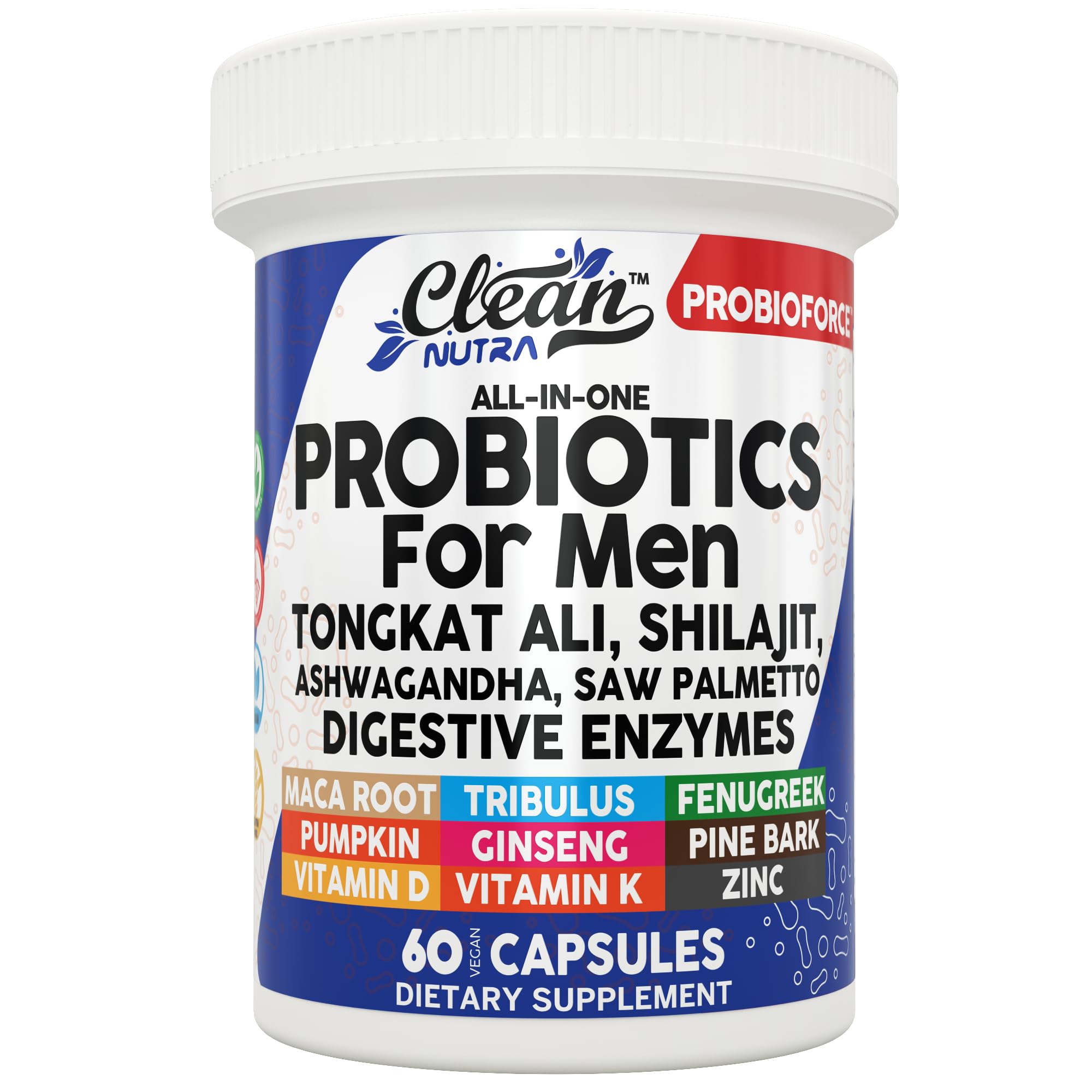 Introducing Probio Force gut health supplements by Clean Nutra. A powerful blend of ingredients like tongkat ali powder organic, shilajit powder organic, organic ashwagandha, saw palmetto for men 1000mg, enzymes for digestion, tribulus terrestris for men powder, ginseng powder organic, black maca root for men, gingko, pine bark extract, pumpkin seeds organic, fenugreek, zinc supplement, d3 k2 vitamin 5000 iu, and probiotic prebiotic blend with digestives that is designed to support gut health, digestion, immune health, and overall well-being. Mens probiotics for gut health work together to promote optimal digestion, support nutrient absorption, and maintain a balanced gut lining. Ashwagandha maca fenugreek adds additional fiber to your diet to support a healthy gut lining and shilajit powder for men, vitamin d 2000 iu, k2 vitamin supplement, and fenugreek oil provides vitality and endurance to further support your health. This well-rounded combination of probiotic for men makes this supplement an excellent choice for those looking to support digestion, endurance, immune health, and promote overall gut health.Your Mens Probiotics for Gut Health Solution : Mens probiotic supplement with tongkat ali extract, shilajit capsule, ashwagandha for men, saw palmetto powder, pre and probiotics for digestive health, tribulus terrestris extract, ginseng powder, maca root capsules for men, gingko biloba capsules 120mg, fenugreek seeds organic, zinc 30mg, and vitamin D3 5000 iu gives you comprehensive support, contributing to your gut, immune, and overall well-being with just 2 capsules a day. Mens Fiber Supplement With Saw Palmetto Extract : By optimizing benefits of K2 D3 vitamin supplement, ksm-66 ashwagandha, and maca powder you create a foundation to support your overall health. Beyond digestion you also get immune support and endurance with ingredients like shilajit capsules for men, ginko biloba, zinc 50mg, and ginseng supplements for men. Tongkat ali for men, tribulus for men, and maca root powder further support with hormone balance contributing to your overall health. Mens Digestive Enzymes With Probiotics And Prebiotics : Shilajit for men, pumpkin seeds, seed probiotics, and pine bark extract capsules provide a well-rounded approach to gut health while D3 K2 vitamin 10000 iu and zinc supplements for men supports overall well-being. Probiotic and prebiotic with fiber pills promotes smoother digestion and eases bloating whereas pumpkin seed oil capsules, vitamin k2, and fenugreek powder support healthy gut lining and gut flora. Mens Probiotic Ashwagandha Supplements : Tongkat ali, shilajit powder, and ashwagandha powder provides an array of immune-supporting benefits while aiding with absorbing minerals more efficiently. Digestive enzymes with fiber capsules, tribulus terrestris powder, vitamin D 5000 iu, and probiotic aid with nutrient absorptions while pumpkin seed oil, ginseng root, and fenugreek capsules support gut health by helping break down proteins, fats, and carbohydrates for better absorption. All-In-1 Probiotic For Men Tongkat Ali Supplement With Shilajit Capsules : A powerful blend of men's prebiotics and probiotics with tongkat ali powder, shilajit gummies, ashwagandha ksm 66, saw palmetto for men, digestive enzymes for men, tribulus terrestris for men, ginseng supplement, maca root, gingko biloba capsules, pine bark extract, pumpkin, fenugreek seeds, zinc supplements, and vitamin D3 K2 with added benefits of digestive enzyme to support gut health for men.
