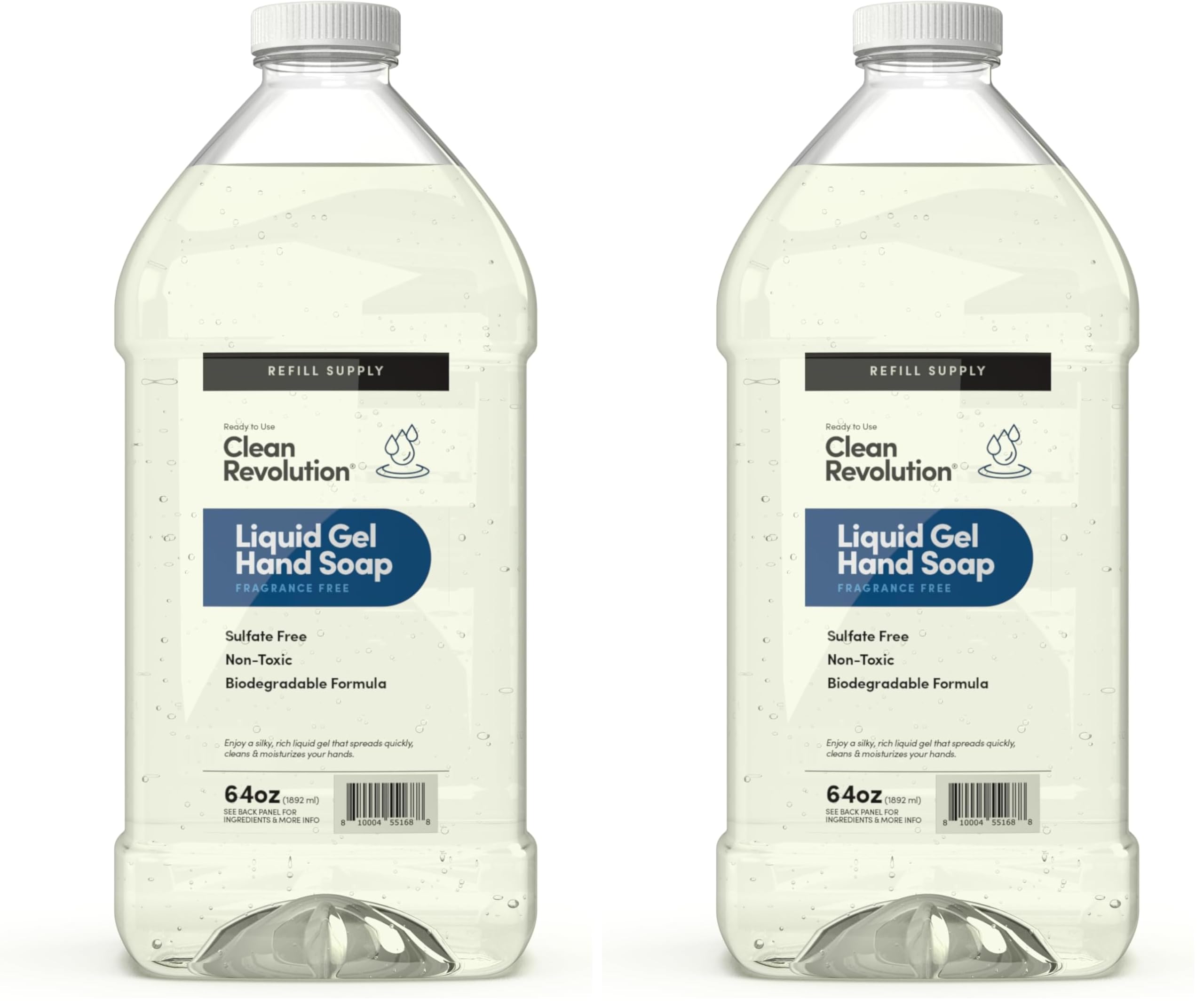 REFILL REUSE: 64 oz refill supply container is designed to deliver exceptional value while also reducing plastic waste from individual single-use bottles, Packaging is 100 recyclable. TRUSTED FAMILY-SAFE INGREDIENTS: All the ingredients used in Clean Revolution formulas are constructed using the latest advances in Green Chemistry and are never tested on animals, which means you can have peace of mind for your family, pets and the planet. ECO-POWERFUL CHEMISTRY: formulated with the latest advances in green chemistry, using biodegradable and non-toxic ingredients that are gentle on the skin and environment free from harsh sulfates and other harmful chemicals. FRAGRANCE-FREE: This product is 100 free of artificial fragrances, unscented and formulated without phthalates or dyes. GENTLE AND MOISTURIZING: sulfate-free formula is gentle on your skin, while its moisturizing properties leave your hands feeling soft and hydrated moisturizing liquid gel that quickly bubbles and is easy to rinse. The information below is per-pack only.