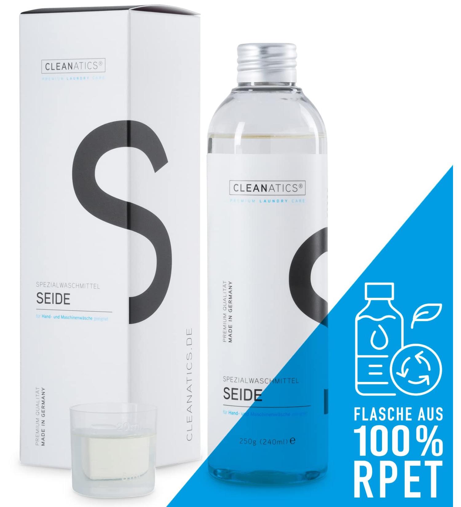 CLEANATICS Seidenwaschmittel Konzentrat für leuchtende Farben bei Seide Viskose - ideal für Seidenbluse, Schal, Seidentuch, Nachtwäsche, Seidenbettwäsche, Bettdecke, Bettwäsche Bademantel (250 g)