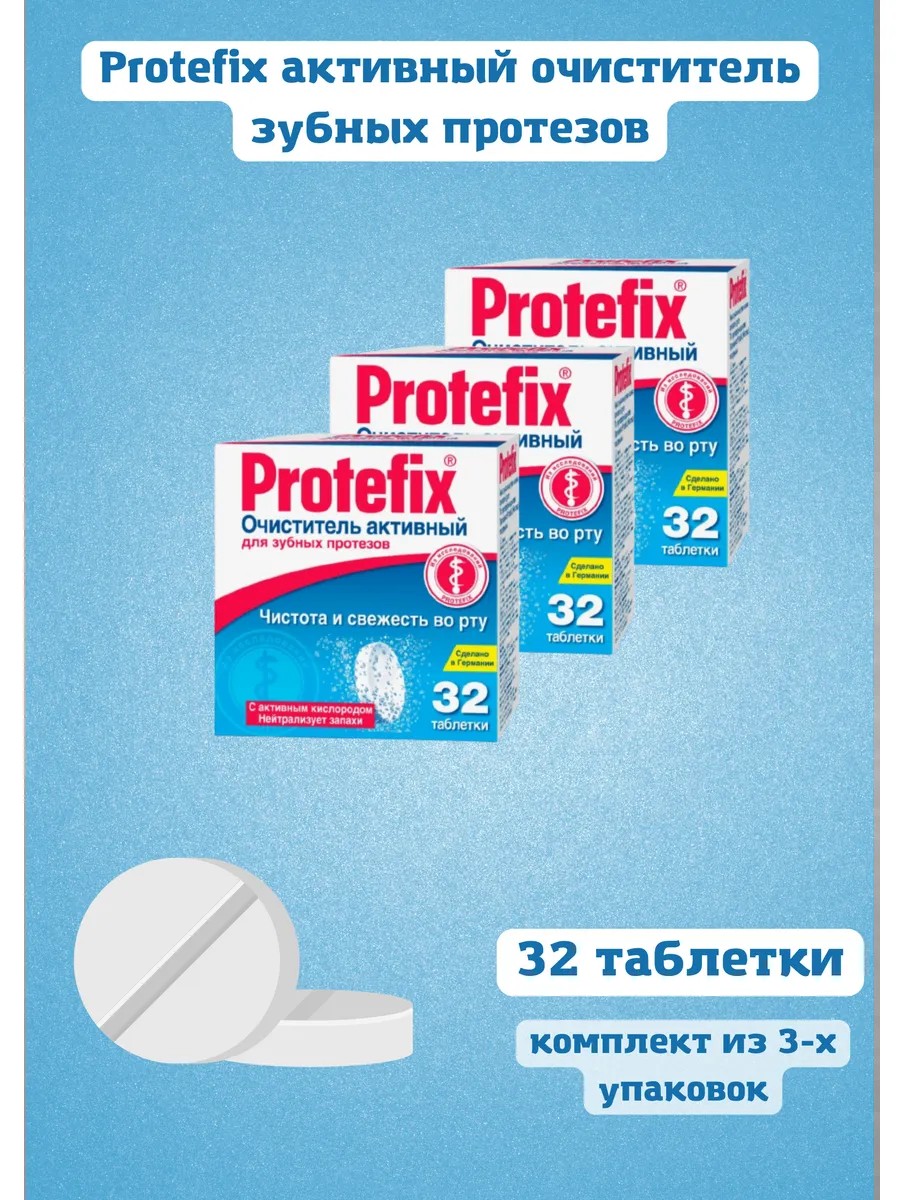 | Комплектация | комплект из 3-х упаковок; Protefix активный очиститель зубных протезов 32 таблетки |