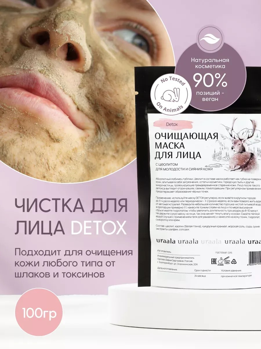 Абсолютный любимец публики. Цеолит в составе маски работает как губка на поверхности кожи, впитывая в себя загрязнения, остатки косметики, городскую пыль и другие микрочастицы, провоцирующие преждевременное старение кожи. Лицо после такого детокса выглядит отдохнувшим, свежим, помолодевшим. При регулярном применении предотвращает образование черных точек. Состав насыщен полезными компонентами, которые выравнивают текстуру кожи, делая ее нежной, гладкой и мягкой. Цеолит вытягивает из пор все накопившиеся токсины и загрязнения, тогда как розовая морская соль богата бета-каротином, который питает кожу. Каолин разглаживает мелкие морщинки, а растительные экстракты смягчают и успокаивают эпидермис. Чистка подходит для проблемной кожи подростков. Натуральные ингредиенты отшелушивают омертвевшие клетки кожи и пилингуют ее, обеспечивая нежный уход и улучшение состояния кожи. Применение: используйте маску DETOX регулярно, если живете в крупном городе: до 3-4 раз в неделю или периодически – 1-2 раза в неделю, если вам повезло жить вдали от автомагистралей. Разведите небольшое количество порошка чистой питьевой водой в пропорции примерно 1:1, нанесите тонким слоем на лицо и по мере высыхания сбрызгивайте гидролатом, чтобы увеличить длительность процедуры до 8-10 минут. Не держите сухую маску на лице, так она начнет тянуть влагу из кожи. Смойте теплой водой (лучше с применением геля для умывания) и нанесите на кожу тоник, гидролат, сыворотку или крем. ' Состав: цеолит, каолин, морская соль, сода, кукурузный крахмал, нутовая мука, экстракт мыльного ореха, экстракт шалфея, экстракт солодки, эфирное масло апельсина. Срок годности: 1 год в сухом темном месте. Не допускать попадания воды!