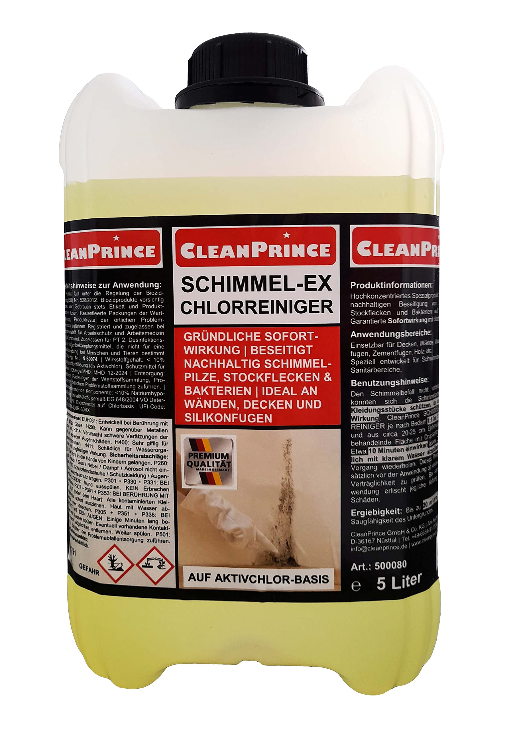 : Highly concentrated special product for the safe and sustainable elimination of mold, stick stains and bacteria based on active chlorine.Guaranteed immediate effect with bleaching effect.Areas of application, application: can be used for ceilings, walls, masonry, silicone joints, cement joints, wood and much more.Specially developed for swimming pool, sauna and sanitary areas.Do not pretreat the mold, otherwise the mold spores could be distributed.CleanPrince Schimmel-Ex Chlorra cleaner 1: 1 to 1: 6 dilute and spray from about 20-25 cm away from around 20-25 cm to the area to be treated with pressure injection.Let it work for about 10 minutes.Then rinse thoroughly with clear water.Repeat the process if necessary.This product must basically be checked for compatibility before being used.In the event of a non -material application, all liability for possible damage expires.You can find further product information on our homepage CleanPrince.de Safety information: This product falls under the regulation of the Biozid Ordinance (EU) No. 528 2012.Use biocidal products carefully.Always read the label and product information before use.Remaining empty packs of the recycling collection, supply product remains of the local problematic collection.Registered and approved by the Federal Institute for Occupational Safety and Occupational Medicine (Baua) in Dortmund.Baua-Rg.No.: N-80074 Warnings Hazard information: EUH031: Developed poisonous gases when touched with acid.H290 can be corrosive against Metal.H314: causes severe burns of the skin and severe eye damage.H412: Harmful for water organisms, with long -term effect.Security advice: P102: must not get into the hands of children.P260: dust smoke gas fog steam aerosol do not inhale.P280: Protective gloves protective clothing eye protection face protection.P301 P330 P331: When swallowed: rinse your mouth.No vomiting.P303 P361 P353: When touched with the skin (or hair): take off all contaminated clothing immediately.Wash or shower with water.P305 P351 P338: When contacted with the eyes: Rinse with water for a few minutes.Remove any existing contact lenses if possible.Rinse further.You will receive safety data sheet on request.for ceilings, walls, masonry and silicone joints.Sustainably removes mold, stick stains and bacteria.thorough immediate effect.: Hochkonzentriertes Spezialprodukt zur sicheren und nachhaltigen Beseitigung von Schimmelpilzen, Stockflecken und Bakterien auf Aktivchlor-Basis. Garantierte Sofortwirkung mit bleichender Wirkung. Anwendungsbereiche, Anwendung: Einsetzbar für Decken, Wände, Mauerwerk, Silikon-Fugen, Zement-Fugen, Holz uvm. Speziell entwickelt für Schwimmbad, Sauna und Sanitärbereiche. Den Schimmelbefall nicht vorbehandeln, sonst könnten sich die Schimmelsporen verteilen. CleanPrince SCHIMMEL-EX CHLORREINIGER je nach Bedarf 1:1 bis 1:6 verdünnen und aus circa 20-25 cm Entfernung auf die zu behandelnde Fläche mit Druckspritze aufsprühen. Etwa 10 Minuten einwirken lassen. Danach gründlich mit klarem Wasser abspülen. Wenn nötig Vorgang wiederholen. Dieses Produkt ist grundsätzlich vor der Anwendung an verdeckter Stelle auf Verträglichkeit zu prüfen. Bei sachfremder Anwendung erlischt jegliche Haftung für mögliche Schäden. Weitere Produktinformationen erhalten Sie auf unserer Homepage Cleanprince.de Sicherheitshinweise: Dieses Produkt fällt unter die Regelung der Biozid-Verordnung (EU) Nr. 528 2012. Biozidprodukte vorsichtig verwenden. Vor Gebrauch stets Etikett und Produktinformationen lesen. Restentleerte Packungen der Wertstoffsammlung, Produktreste der örtlichen Problemstoffsammlung zuführen. Registriert und zugelassen bei der Bundesanstalt für Arbeitsschutz und Arbeitsmedizin (BAuA) in Dortmund. BAuA-Rg. Nr.: N-80074 WARNHINWEISE Gefahrenhinweise: EUH031: Entwickelt bei Berührung mit Säure giftige Gase. H290: Kann gegenüber Metallen korrosiv sein. H314: Verursacht schwere Verätzungen der Haut und schwere Augenschäden. H412: Schädlich für Wasserorganismen, mit langfristiger Wirkung. Sicherheitsratschläge: P102: Darf nicht in die Hände von Kindern gelangen. P260: Staub Rauch Gas Nebel Dampf Aerosol nicht einatmen. P280: Schutzhandschuhe Schutzkleidung Augenschutz Gesichtsschutz tragen. P301 P330 P331: BEI VERSCHLUCKEN: Mund ausspülen. KEIN Erbrechen herbeiführen. P303 P361 P353: BEI BERÜHRUNG MIT DER HAUT (oder dem Haar): Alle kontaminierten Kleidungsstücke sofort ausziehen. Haut mit Wasser abwaschen oder duschen. P305 P351 P338: BEI KONTAKT MIT DEN AUGEN: Einige Minuten lang behutsam mit Wasser spülen. Eventuell vorhandene Kontaktlinsen nach Möglichkeit entfernen. Weiter spülen. Sicherheitsdatenblatt erhalten Sie auf Anfrage.für Decken, Wände, Mauerwerk und Silikonfugen. beseitigt nachhaltig Schimmelpilze, Stockflecken und Bakterien. gründliche Sofortwirkung.Cleanprince 5 Liter Schimmel - Ex Chlorreiniger Schimmelex Schimmelentferner chlorhaltig Schimmelstop Schimmelex Stockflecken Grünspan Schimmelpilze Kältebrücke Reiniger Schimmelreiniger