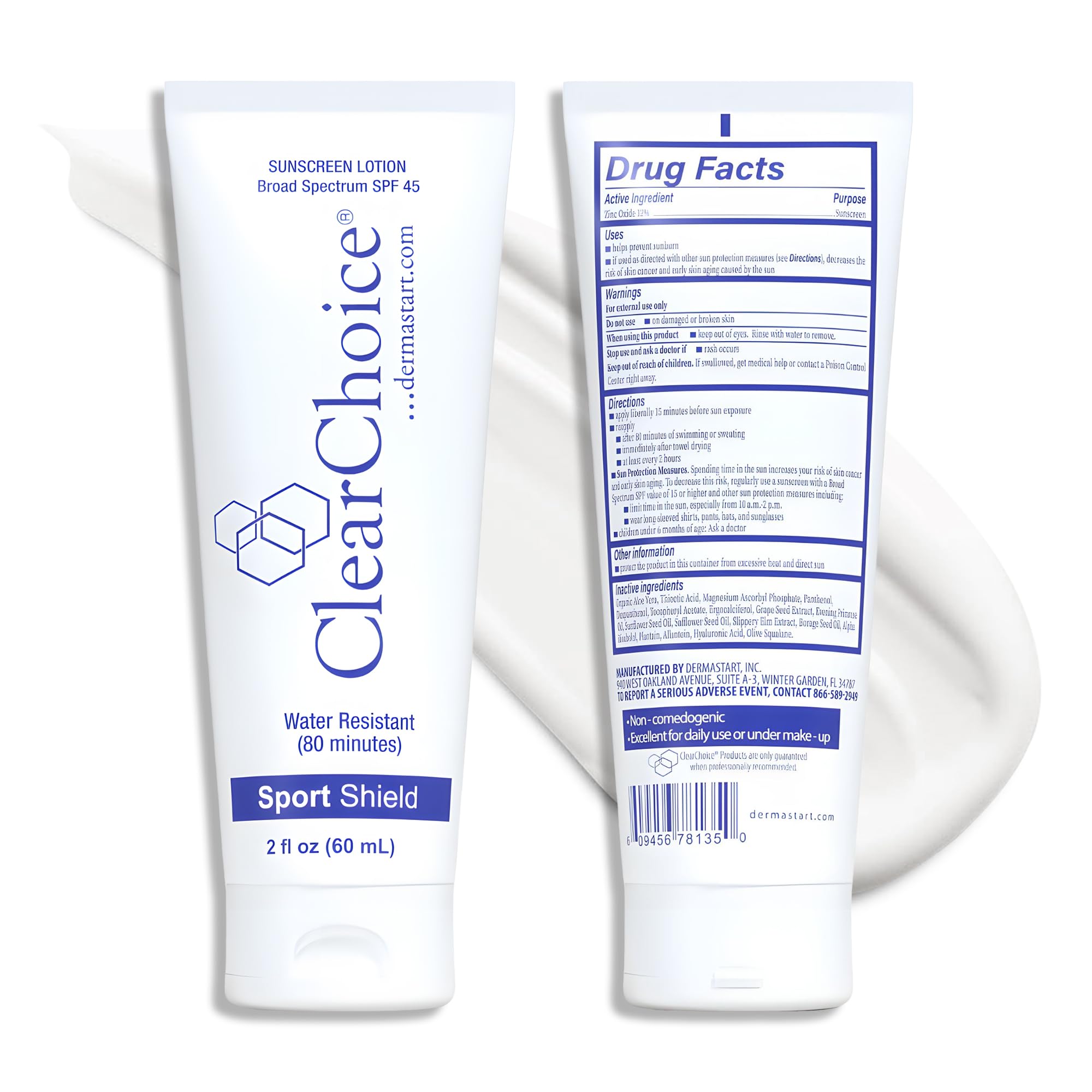 Experience effortless, everyday protection with ClearChoice Sport Shield SPF 45, a mineral-based sunscreen and moisturizer designed for comfort and clarity. Featuring micronized zinc oxide, this lightweight, non-greasy SPF applies clear and leaves skin silky—not shiny. Enriched with hyaluronic acid, vitamins C and E, and plant-based oils, it helps keep skin hydrated and balanced throughout the day. Water- and sweat-resistant for 80 minutes, it's perfect for outdoor workouts, lake days, and daily commutes alike. Formulated without parabens, synthetic fragrance, or pore-clogging ingredients, it supports a healthy, fresh-looking complexion for all skin types — even sensitive or acne-prone. Dermatologist approved Clear finish Daily wear comfort DIRECTIONS FOR USE Shake well before use. Apply liberally to face, neck, décolleté, and hands 15 minutes before sun exposure. Reapply every 2 hours or after swimming or perspiring. KEY INGREDIENTS Micronized Zinc Oxide (12 ) Hyaluronic Acid Aloe Vera Vitamin C (Magnesium Ascorbyl Phosphate) Vitamin E Evening Primrose Oil Sunflower Safflower Seed Oils Chamomile Plantain Olive Squalane Free From: Parabens Fragrance GMOs Animal Testing Skin Type: All – Dry, Oily, Sensitive, Acne-Prone