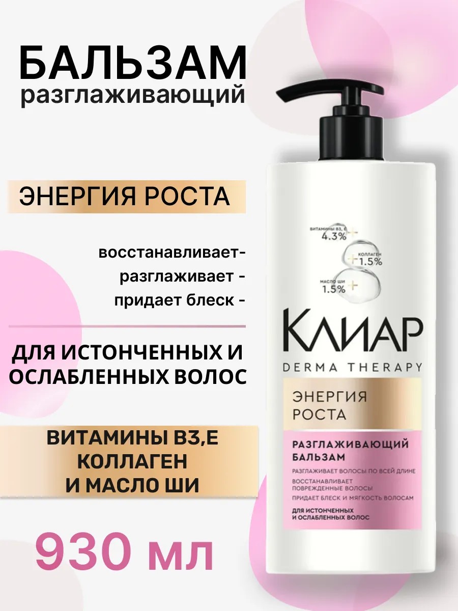 Бальзам для волос разглаживающий Клиар Derma Therapy Энергия роста - это эффективное средство для ухода за истонченными и ослабленными волосами, созданное специально для женщин и девушек. Косметический уходовый продукт разработан для восстановления и питания поврежденных волос.