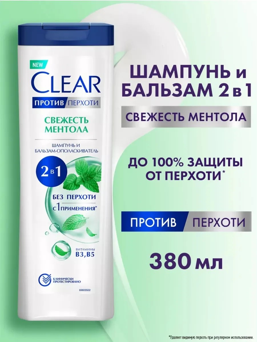 Clear Anti-Dandruff 2-in-1 Menthol Shampoo and Conditioner is specially formulated to combat dandruff and its recurrence. The shampoo combats scalp dryness and itching* and helps regulate hair oiliness. Clear Anti-Dandruff 2-in-1 Menthol Shampoo and Conditioner contains: - 3 ZeroTech anti-dandruff technology; - vitamins B3 and B5. 3 ZeroTech technology eliminates dandruff and prevents its recurrence, combats oiliness, itching*, and dry scalp. The shampoo deeply nourishes and moisturizes hair. Clear Anti-Dandruff 2-in-1 Menthol Shampoo and Conditioner has a pleasant menthol aroma. The subtle scent is perfect for both women and men. Clear 2-in-1 Menthol Anti-Dandruff Shampoo and Conditioner gently and effectively cleanses the scalp, making it suitable for daily use. Removes visible dandruff with regular use. *Caused by dandruff. Within the hair cuticle.