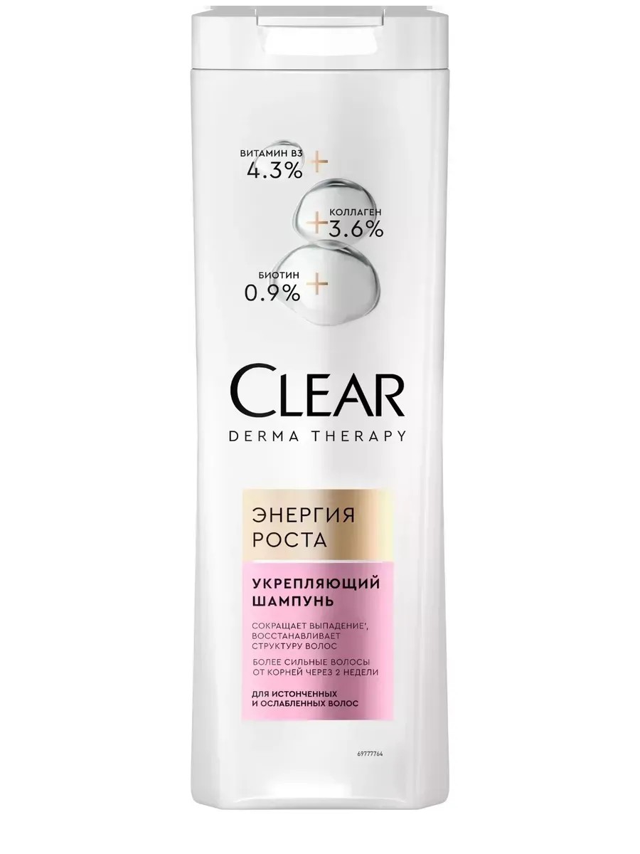 Clear Derma Therapy Шампунь против выпадения Энергия роста 380мл, 1 штука. Из-за постоянных стрессов и высокого темпа жизни наши волосы могут стать ломкими и тусклыми, склонными к выпадению. Эксперты Clear разработали новую серию продуктов Clear Derma Therapy – система ухода для восстановления баланса кожи головы и силы волос от корней до кончиков. В основе Clear Derma Therapy подход скинификации – умный уход не только за волосами, но и кожей головы. Ведь волосы не могут выглядеть здоровыми, если есть проблемы с кожей головы. Второй шаг на пути к ухоженным волосам – укрепляющий шампунь Энергия роста. Его формула содержит 3.6% коллагена и 0.9% биотина, укрепляет волосы по всей длине. 4.3% Витамина В3 в составе сокращает выпадение, восстанавливая структуру волос. Объем 380 мл прослужит долго, нежный уходовый аромат приятен во время использования. 1-2 раза в неделю используйте скраб с минеральными гранулами, он глубоко очищает, и стимулирует рост волос. Далее воспользуйтесь укрепляющим шампунем и нанесите уплотняющую маску. Завершающий шаг ухода – несмываемая сыворотка для волос. Именно такой комплексный уход позволяет справиться с проблемой выпадения волос, ведь продукты серии воздействуют на кожу головы и волосы. Результат: более сильные волосы от корней через 2 недели!