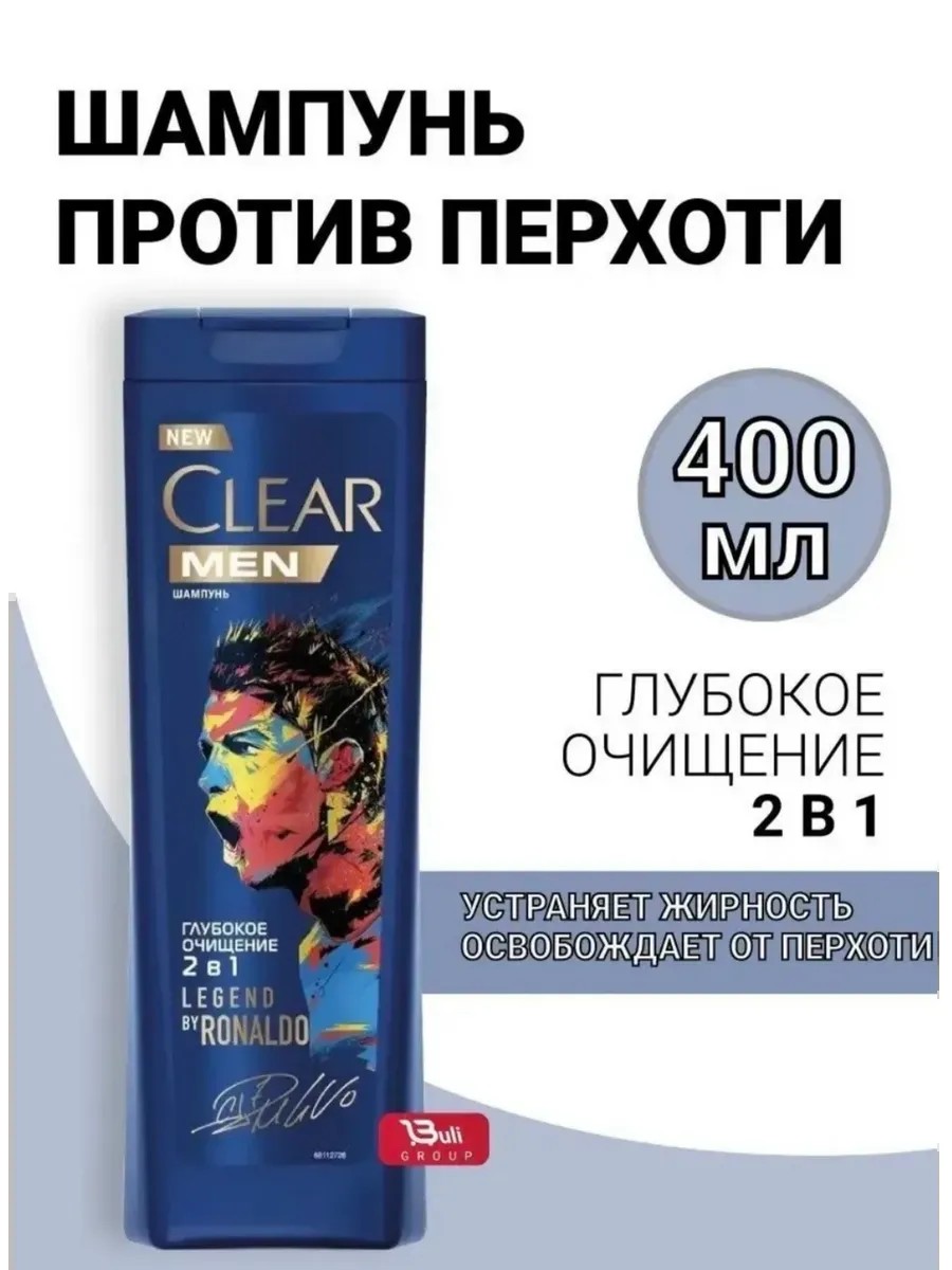 Specifically designed for men, Clear Men Deep Cleansing 2-in-1 Shampoo is the legendary shampoo from the legendary footballer. Developed in collaboration with Ronaldo, this shampoo is exclusively** for active men. It has been stress-tested by Ronaldo. Confident of clean hair in just 30 seconds and freshness for up to 8 hours. Triple anti-dandruff technology effectively combats dandruff*, cleanses the scalp, and activates its natural defenses. To improve scalp protection and hydration, in addition to the key anti-dandruff ingredient, zinc pyrithione, the updated Clear formula includes an amino acid complex and natural sea salt, which imparts exceptional freshness. An updated system with guar improves the delivery and deposition of active ingredients, as well as combating Malassezia fungus, the main cause of dandruff. Effectively cleanses hair and scalp, energizing you for extraordinary victories. Men tend to have oilier scalps due to increased secretion of natural body oils (sebum), which can lead to more dandruff. Clear Men shampoos contain active ingredients that combat the most common scalp and hair concerns. Put an end to recurring dandruff with regular use of Clear products, formulated with Unilever's latest scalp technology to help you get rid of dandruff for good. *Dandruff protection guaranteed. Removes visible dandruff with regular use. Dear Customers, Please note that packaging design may change. Availability is subject to stock availability. Directions for use: Apply to damp hair, massage into scalp, and rinse. For best results, use Clear shampoo daily.