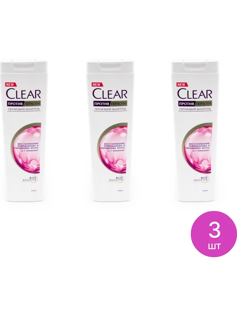 Clear / Клеар Шампунь от перхоти с витамином В3 и аминокислотами, восстановление для окрашенных волос 400мл / косметика уход. Комплект состоит из 3 шт. Цена за комплект. Жидкий шампунь от перхоти Clear благодаря входящим в состав натуральным ингредиентам заботится о волосах, укрепляет и питает их, придает волосам ухоженный, здоровый вид. Его цель: яркий здоровый цвет волос, устранение сухости и ломкости. Женский шампунь против перхоти Clear Восстановление поврежденных и окрашенных волос создан с учетом особенностей женской кожи головы: регулярные окрашивания и смена имиджа сушат кожу, способствуя появлению перхоти, истончению, хрупкости и ломкости волос. Шампунь Clear Восстановление поврежденных и окрашенных волос обладает комплексным действием: очищает, питает и увлажняет, избавляет от перхоти и эффективно восстанавливает волосы, возвращая им утраченную силу, блеск и гладкость. Шампунь для окрашенных волос Clear Восстановление был разработан экспертами Clear с учетом строения кожи головы и с технологией тройной защиты против перхоти*. Он содержит не только защищающий от перхоти цинк пиритион, но и обогащен витамином В3 и аминокислотами. Шампунь от перхоти с глицином, глицерином и аргинином питает и активизирует естественные защитные силы кожи головы. Шампунь без парабенов Clear Восстановление против перхоти для окрашенных волос позволяет совместить уход за волосами с наслаждением изысканным ароматом. Его парфюмерная композиция построена на сплетении фруктовых и ягодных нот, в которых соседствуют фиалка и красная смородина, роза и малина, ежевика и жасмин. Даже после смывания шампунь для волос оставляет стойкий чувственный шлейф, где играет белый мускус и утонченно-сладкая ваниль. шампунь для волос женский / шампунь от выпадения волос для женщин.