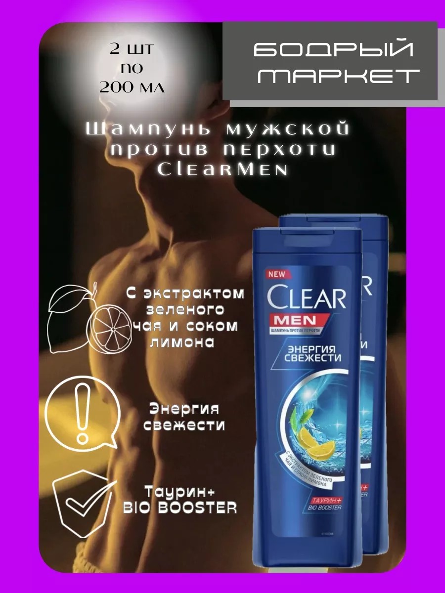 Комплект 2шт. Специально разработанный для мужчин шампунь Clear Men Энергия свежести с соком лимона и экстрактом зеленого чая активизирует естественную защиту кожи головы**, защищая от перхоти и надолго оставляя ощущение, как будто вы только что из душа. Заряжающий энергией аромат для душа оставляет ваши волосы и кожу головы свежими на весь день. Здоровые волосы без перхоти – это, в первую очередь, здоровая кожа головы. Clear не только защищает от видимой перхоти, но и борется с проблемой на более глубоком уровне. Экспертами Clear была разработана тройная технология защиты от перхоти, которая эффективно борется с проблемой перхоти*, очищает кожу головы и активирует ее естественную защиту. Для улучшения защиты и увлажнения кожи головы, в дополнение к ключевому компоненту от перхоти – цинку пиритиону, в обновленную формулу Clear добавлен комплекс аминокислот. Обновленная система с Гуаром делает более эффективными доставку и депозицию активных веществ, а также борьбу с грибком Malassezia, являющимся главной причиной появления перхоти. У мужчин наблюдается тенденция к большей жирности кожи головы вследствие более выраженной секреции естественных жиров тела (кожного сала), следовательно, у мужчин наблюдается тенденция к большему количеству перхоти. Активные веществе шампуней СLEAR Men борются с самими актуальными проблемами кожи головы и волос. А для усиления естественной защиты кожи головы в состав средств был добавлен комплекс аминокислот, состоящий из глицина, таурина и ниацинамида.