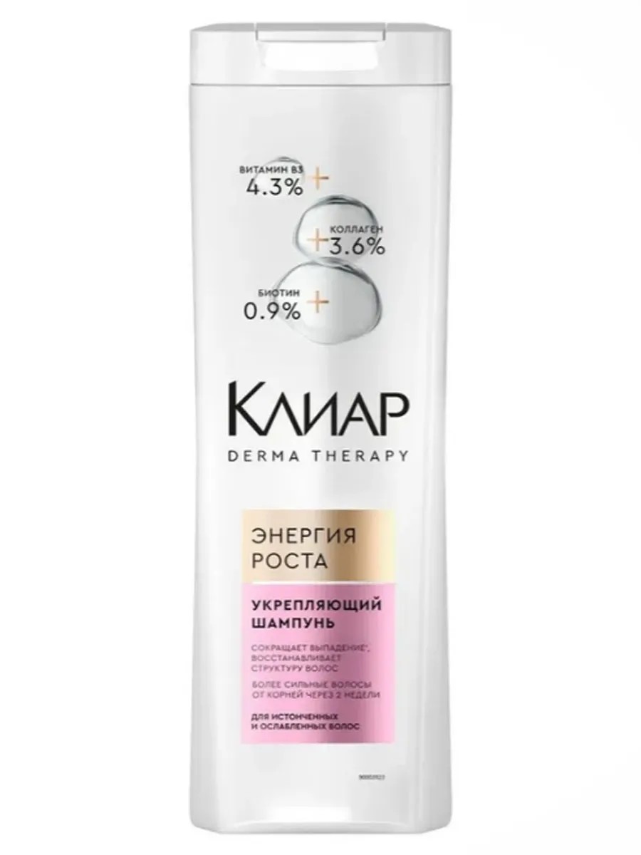 Второй шаг на пути к ухоженным волосам – укрепляющий шампунь Энергия роста. Его формула содержит 3.6% коллагена и 0.9% биотина, укрепляет волосы по всей длине. 4.3% Витамина В3 в составе сокращает выпадение, восстанавливая структуру волос. Объем 380 мл прослужит долго, нежный уходовый аромат приятен во время использования.