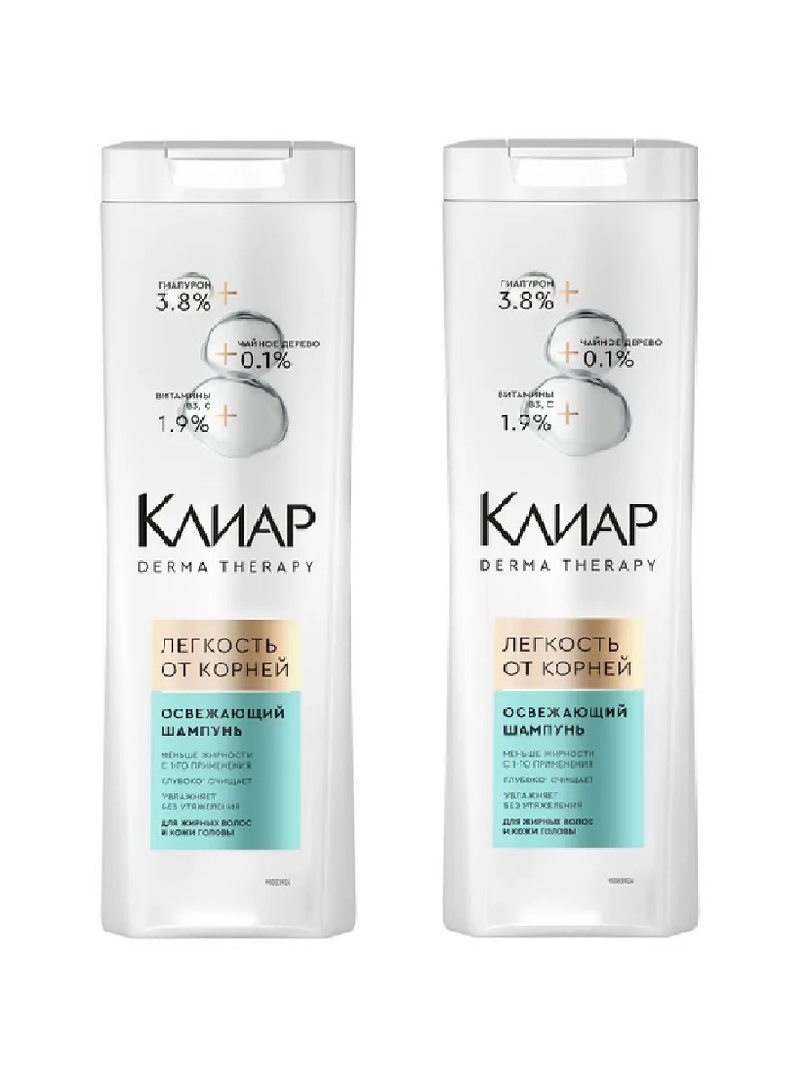 Клиар, Шампунь Легкость от корней, 2 шт по 380 мл. Излишняя жирность волос и кожи головы становится проблемой и вмешивается в ваши планы? Волосы не имеют объема и уже на второй день выглядят неухоженными? Добавьте в свой уход новую серию продуктов Клиар Derma Therapy Легкость от корней. Первый шаг – освежающий шампунь. Вы заметите меньше жирности уже с 1-го применения! Формула шампуня с 0.1% чайного дерева глубоко и бережно очищает, придавая свежесть. 3.8% Гиалурона, 1.9% Витаминов В3, С увлажняют волосы, придавая им естественный блеск и сияние. Предотвращает раздражение и шелушение кожи головы.
