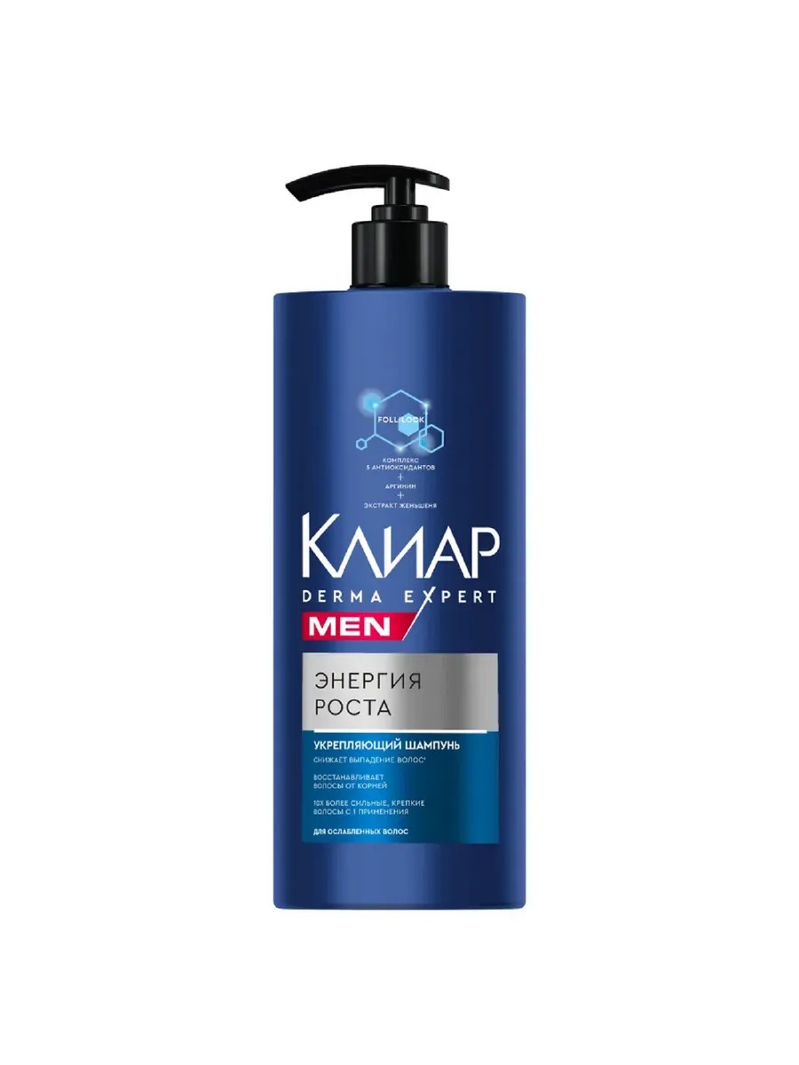 Клиар Шампунь мужской Энергия роста укрепляющий, 1 л. Клиар Men Derma Expert Энергия роста — мужской шампунь укрепляющий от выпадения волос с комплексом из 5 антиоксидантов, аргинином и экстрактом женьшеня в новом увеличенном формате. Шампунь разработан специально для ослабленных волос и обеспечивает заметный результат: 10Х более сильные и крепкие волосы с первого применения!
