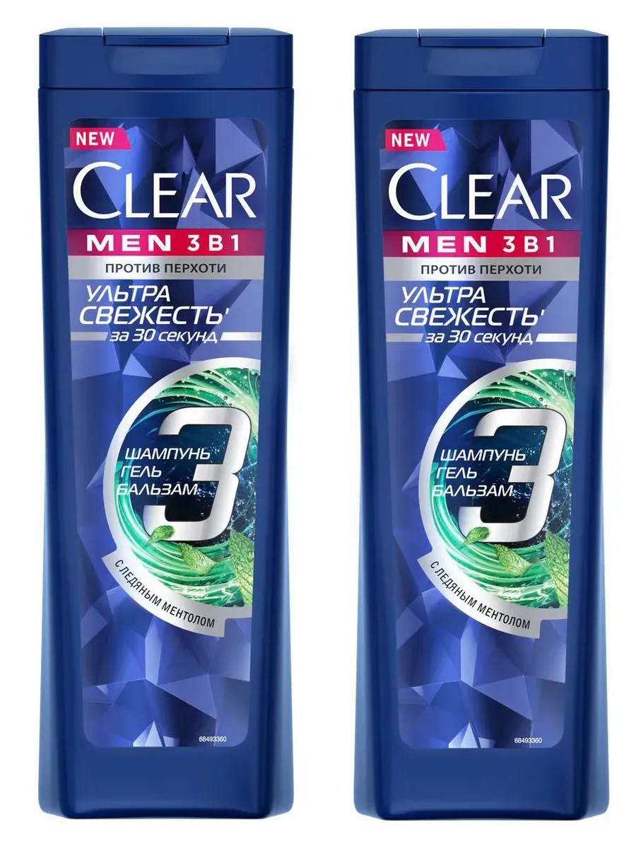 Clear, шампунь мужской Ультра свежесть 3в1, 400 мл, 2 шт. Шампунь-бальзам, гель для душа Ультра свежесть – это средство 3в1 – шампунь, бальзам и гель для душа, мгновенно смывающий грязь, жир и перхотьx. Бодрящий аромат ментола заряжает энергией и свежестью на весь день, подчеркивает мужественность и позволяет чувствовать себя уверенно в любой ситуации. Активные компоненты эффективно очищают и увлажняют кожу головы. Благодаря этому шампунь-бальзам, гель для душа Ультра свежесть с ментолом устраняет видимую перхоть и препятствует ее повторному появлению. Шампунь-бальзам, гель для душа Ультра свежесть создан специально для активных мужчин, день которых расписан по минутам: всего за 30 секунд он позволяет ощутить свежесть и чистоту, которая сохранится на длительное время.