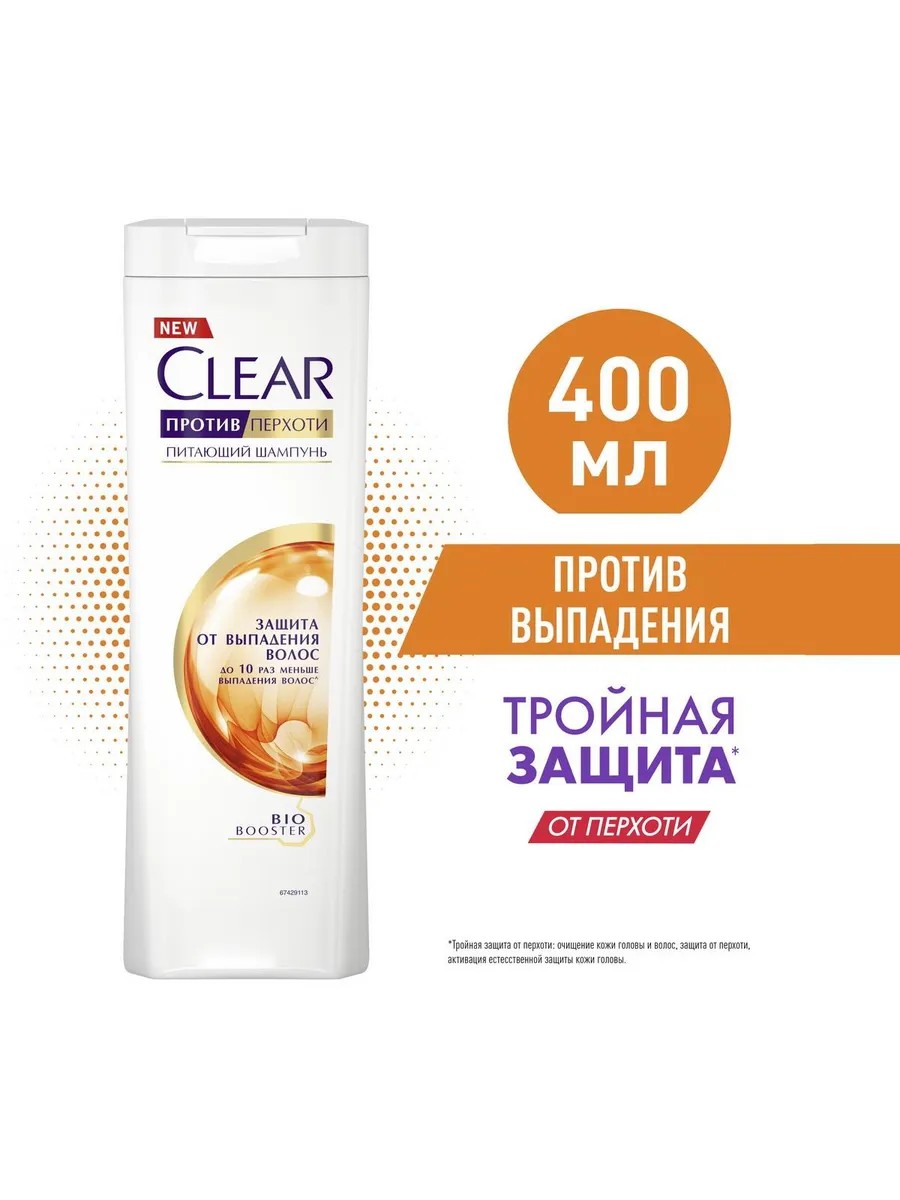 Clear шампунь против перхоти Защита от выпадения волос избавляет от перхоти* и укрепляет волосы от самых корней, сокращая их выпадение до 10 раз**. Шампунь Clear заметно улучшает состояние волос, заряжает их силой и энергией. Шампунь эффективно устраняет загрязнения и помогает восстановить функции защитного барьера кожи головы, работая против выпадения волос. Clear шампунь против перхоти Защита от выпадения волос создан на основе тройной технологии’ защиты от перхоти и содержит: гуар и глицерин; аргинин и глицин; витамин В3 и цинк пиритион; экстракт имбиря. Активные компоненты увлажняют и питают кожу головы и укрепляют волосы от самых корней, значительно улучшая их внешний вид. Благодаря составу Clear устраняет видимую перхоть и борется с причиной ее повторного появления при регулярном использовании. Clear шампунь против перхоти Защита от выпадения волос обладает нежным ароматом с цветочными нотами. Парфюмерная композиция встречает нежным цветочным аккордом, составленным из ароматов благородной розы, хрупкой фиалки и душистого жасмина. В ее сердце сплелись акценты спелой смородины и сладких яблок, а шлейф окружает стойкими мускусными переливами в сопровождении сладкой ванили. Clear шампунь против перхоти Защита от выпадения волос в удобном флаконе объемом 400 мл отлично поместится на полочке в душе, а само средство расходуется достаточно экономно. Подходит для ежедневного применения. *Удаляет видимую перхоть при регулярном использовании. **Из-за ломкости. Инструментальный тест Unilever: по сравнению с шампунем без кондиционирующих компонентов при трехкратном использовании. ‘Очищение кожи головы и волос, защита от перхоти, активация естественной защиты кожи головы.
