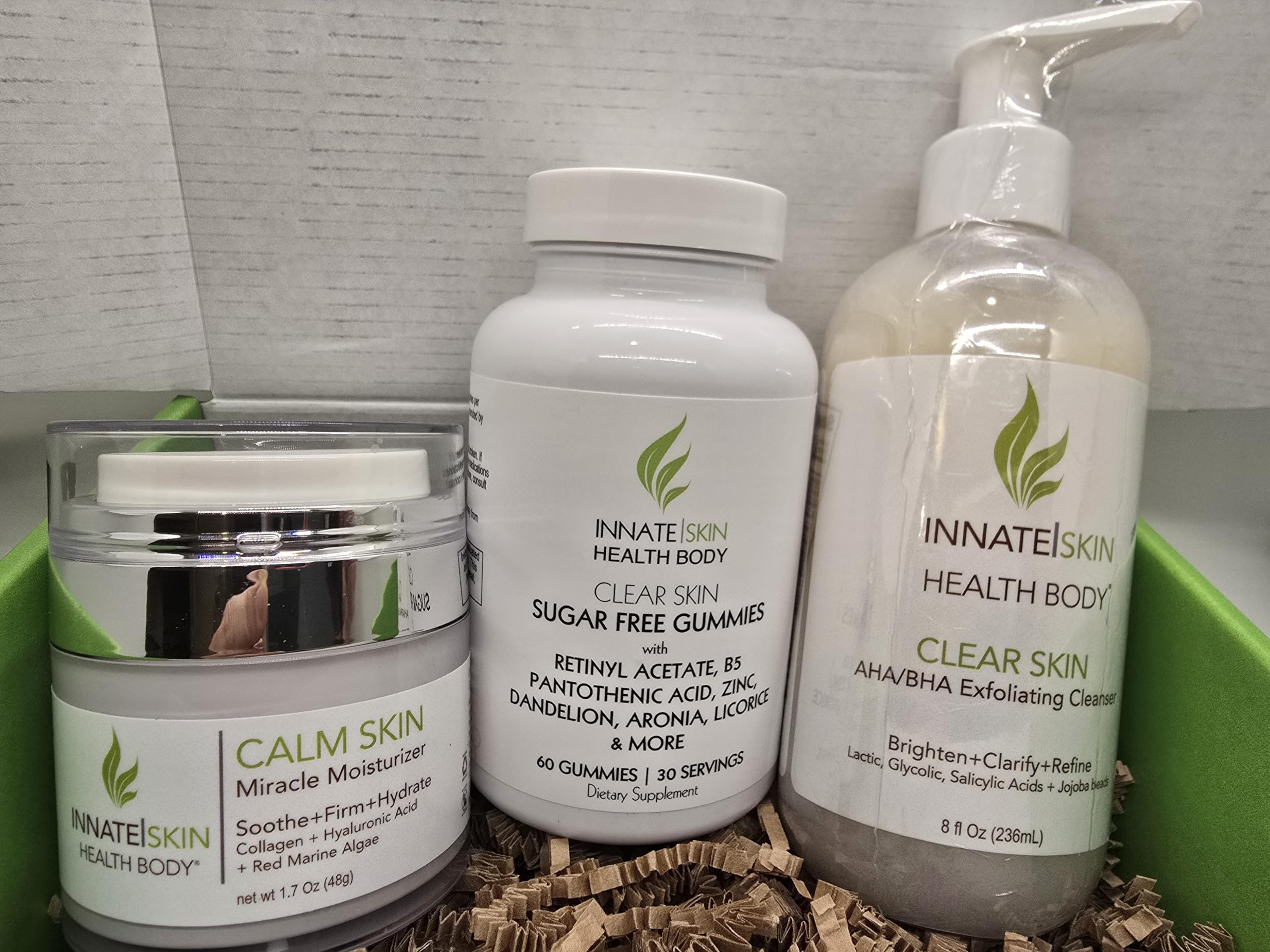 Clear Skin Gummies, AHA BHA Cleanser and Calm Skin Moisturizer all in one box. All from Innate Skin Health Body.