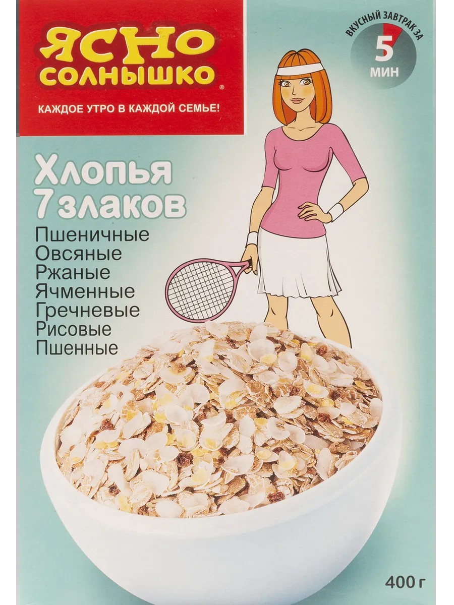 Yasno Solnyshko 7-Grain Oatmeal, 400g, Porridge, Healthy Eating. Sometimes you want a quick, tasty and healthy snack and then continue with your work. Yasno Solnyshko 7-Grain Oatmeal is perfect for these situations. It strengthens the immune system, improves mood, and provides energy. The flakes are sold in individual 400g packaging and are made using a special technology that preserves the grain germ. They contain soluble and insoluble fiber, which normalizes digestion, maintains a healthy figure, and promotes a feeling of satiety. Looking for a healthy product that's easy and quick to prepare and ideal for healthy eating and a light snack? Buy Yasno Solnyshko oatmeal. Healthy Eating / Porridge / Oatmeal.