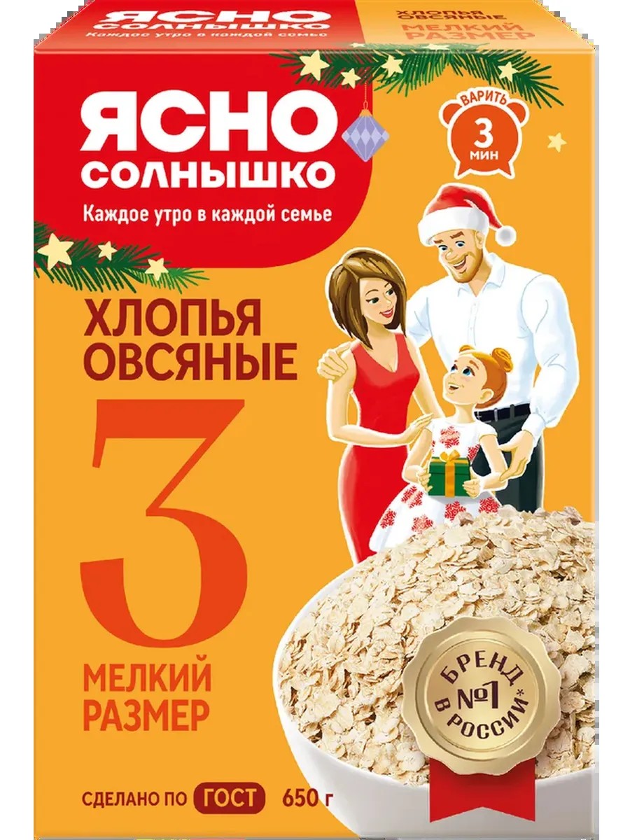 Natural oat flakes No. 3 from Yasno Solnyshko are made using modern technology to preserve the germ and have the smallest size in the brand's line of numbered flakes. Our oat product is ideal for healthy nutrition for children and adults. Thanks to their structure, these delicate flakes cook in just 3 minutes while delivering maximum nutrition. The easiest way to change the flavor of oatmeal is to add nuts and fruit. How about pomegranate seeds, packed with antioxidants, folic acid, and vitamins C and K? A memorable appearance and original texture are guaranteed! The new convenient family-size package (650g) of oat flakes No. 3 is perfect for a large family. Treat yourself and your loved ones to delicious and healthy breakfasts from Yasno Solnyshko!