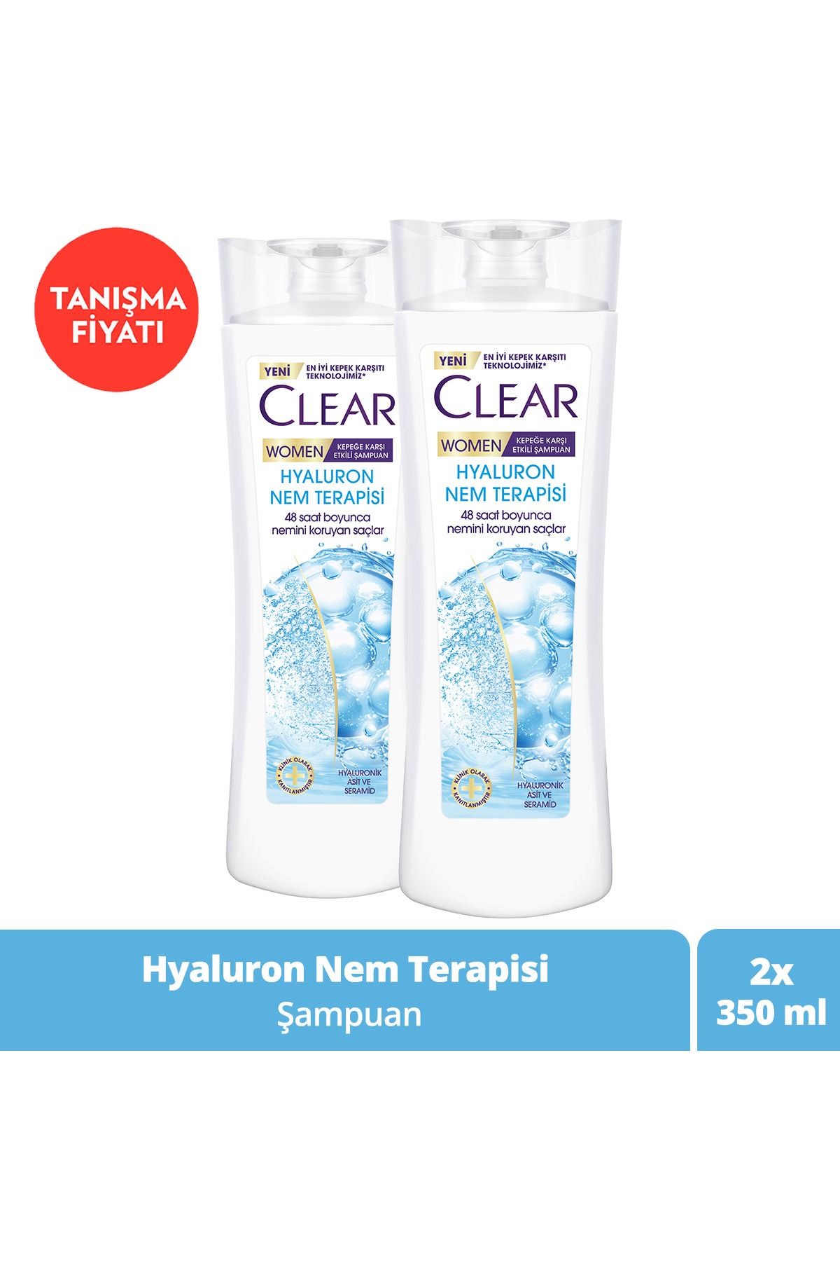Clear Women Effective Anti-Dandruff Hair Care Shampoo Hyaluron Moisture Therapy 350 ml Clear Women Hyaluron Moisture Therapy Shampoo is specially designed to moisturize your hair and scalp. The most important reason for volumeless and dry hair is a scalp that has lost its moisture. New Clear Women Hyaluron Moisture Therapy Shampoo locks moisture into dry scalp with hyaluronic acid and ceramide in its content. It restores the moisture your dry scalp loses daily and gives you 2 times fuller hair that retains its moisture for 48 hours. Developed with Clear's best anti-dandruff technology , this shampoo gently cleanses your hair and scalp while moisturizing it at the same time. Thanks to its lightweight Moisture-Lock technology that does not weigh down your hair, it allows you to have a scalp with 4 times more moisture . While it moisturizes your hair and scalp, it also provides 100 protection against dandruff with its clinically proven formula. You can use Clear Women Hyaluron Moisture Therapy Shampoo by massaging your wet hair and scalp in the shower. It is recommended to use it every day to achieve better results. To make your hair care routine more effective, you can apply Clear Women Hyaluron Moisture Therapy Serum to your hair after showering, to your damp or dry scalp. This two-step care routine meets the daily moisture needs of your hair and scalp and makes your hair fuller. To add moisture to your dehydrated scalp and have full hair, choose Clear Women Hyaluron Moisture Therapy Shampoo and enjoy well-groomed and full hair. Compared to Clear's previous technology. Helps prevent visible dandruff in regular use. After 4 weeks of regular use, compared to scalp washed with standard shampoo. Result of 4 weeks of regular use. Compared to hair with sebum applied. Ingredients: Aqua, Sodium Laureth Sulfate, Cocamidopropyl Betaine, Dimethiconol, Sodium Chloride, Dimethicone, Parfum, Sodium Benzoate, Citric Acid, Piroctone Olamine, Carbomer, Guar Hydroxypropyltrimonium Chloride, Niacinamide, Glycerin, TEA-Dodecylbenzenesulfonate, TEA-Sulfate, Mica, Disodium EDTA, Acrylamidopropyltrimonium Chloride Acrylamide Copolymer, Laureth-23, Poloxamer 407, Phenoxyethanol, Helianthus Annuus (Sunflower) Seed Oil, Laureth-4, PPG-9, Glycine, PEG-4, Xanthan Gum, Sodium Hydroxide, Ceramide NG, Hydrolyzed Hyaluronic Acid, Citronellol, Hexyl Cinnamal, Linalool, CI 77891.