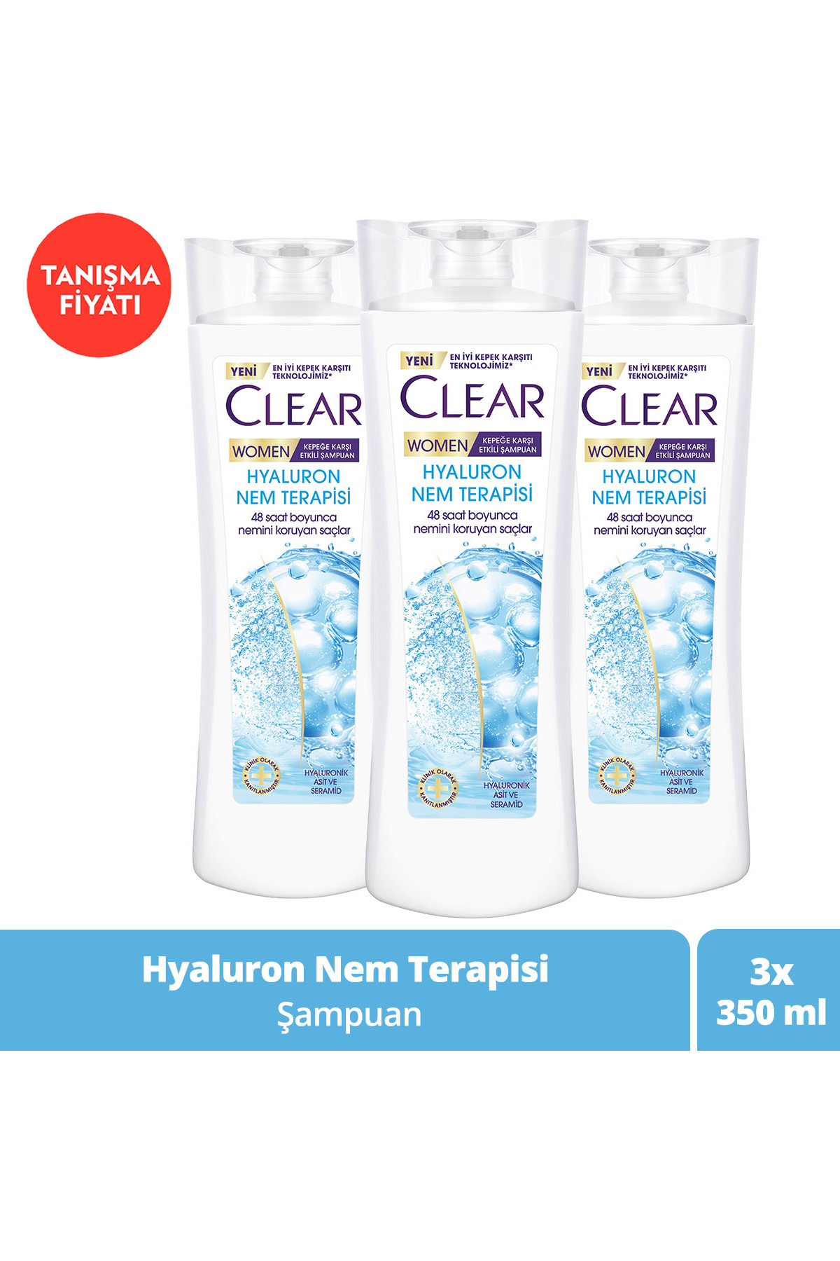 Clear Women Kepege Karsi Etkili Saç Bakim Sampuani Hyaluron Nem Terapisi 350 ml Clear Women Hyaluron Nem Terapisi Sampuan, saçlarinizi ve saç derinizi nemlendirmek için özel olarak tasarlanmistir. Hacimsiz ve kuru saçlarin en önemli nedeni nemini kaybetmis saç derisidir. Yeni Clear Women Hyaluron Nem Terapisi Sampuan, içerigindeki hyaluronik asit ve seramid ile kuru saç derisine nemi hapseder. Kuru saç derinizin günlük kaybettigi nemi geri kazandirir ve 48 saat boyunca nemini koruyan 2 kat dolgun saçlara sahip olmanizi saglar. Clear'in en iyi kepek karsiti teknolojisiyle gelistirilen bu sampuan, saç ve saç derinizi nazikçe temizlerken ayni zamanda nemlendirir. Saçi agirlastirmayan, hafif-yapili Moisture-Lock teknolojisi sayesinde 4 kat daha fazla nem içeren saç derisine sahip olmanizi saglar. Saçlarinizi ve saç derinizi nemlendirirken, klinik olarak kanitlanmis formülüyle kepege karsi da 100 koruma saglar. Clear Women Hyaluron Nem Terapisi Sampuan'i dusta islak saç ve saç derinize masaj yaparak kullanabilirsiniz. Daha iyi sonuç elde etmek için her gün kullanilmasi önerilir. Saç bakim rutininizi daha etkili kilmak için dus sonrasi saçlariniza Clear Women Hyaluron Nem Terapisi Serum'u nemli ya da kuru saç derinize uygulayabilirsiniz. Bu iki asamali bakim rutini, saçlarinizin ve saç derinizin günlük nem ihtiyacini karsilar ve saçlarinizi dolgunlastirir. Nemini kaybetmis saç derisine nem kazandirmak ve dolgun saçlara sahip olmak için siz de Clear Women Hyaluron Nem Terapisi Sampuan'i tercih edin, bakimli ve dolgun saçlarin keyfini çikarin. Clear'in önceki teknolojisi ile kiyaslandiginda. Düzenli kullanimda gözle görünür kepegi önlemeye yardimci olur. 4 haftalik düzenli kullanim sonrasi, standart sampuan ile yikanmis saç derisine kiyasla. 4 haftalik düzenli kullanim sonucu. Sebum uygulanmis saç ile kiyaslandiginda. Içindekiler: Aqua, Sodium Laureth Sulfate, Cocamidopropyl Betaine, Dimethiconol, Sodium Chloride, Dimethicone, Parfum, Sodium Benzoate, Citric Acid, Piroctone Olamine, Carbomer, Guar Hydroxypropyltrimonium Chloride, Niacinamide, Glycerin, TEA-Dodecylbenzenesulfonate, TEA-Sulfate, Mica, Disodium EDTA, Acrylamidopropyltrimonium Chloride Acrylamide Copolymer, Laureth-23, Poloxamer 407, Phenoxyethanol, Helianthus Annuus (Sunflower) Seed Oil, Laureth-4, PPG-9, Glycine, PEG-4, Xanthan Gum, Sodium Hydroxide, Ceramide NG, Hydrolyzed Hyaluronic Acid, Citronellol, Hexyl Cinnamal, Linalool, Cl 77891.